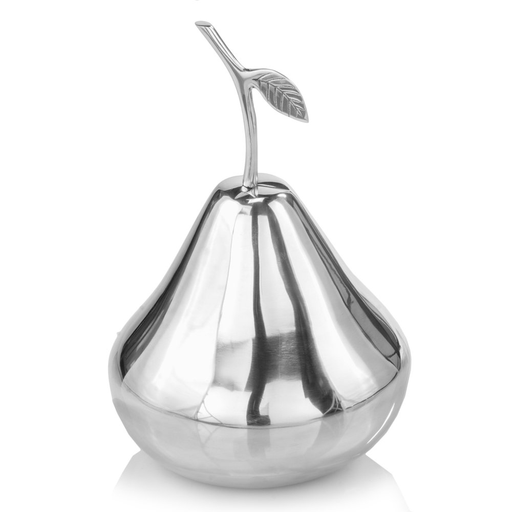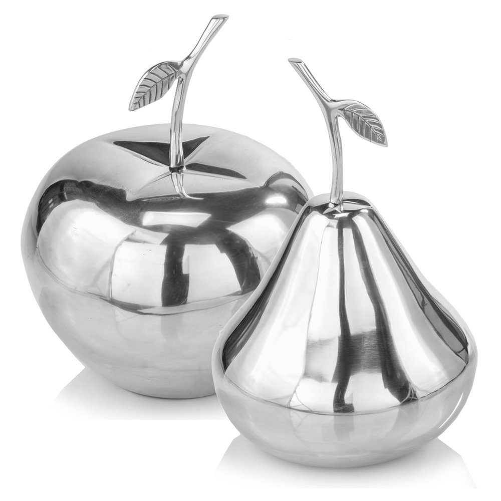 This decorative pear sculpture crafted from high grade buffed aluminum boasts a sleek silver color that adds a contemporary touch to any space. The modern style of this piece complements a variety of decor styles, making it a versatile and chic accent for your home. Its intricate design and expert craftsmanship make it a standout decorative item that exudes sophistication and style. Perfect for those seeking a unique and eye-catching addition to their living space, this sculpture is sure to impress with its high-quality construction and trendy aesthetic. 17-inch H x 12-inch W x 12-inch D