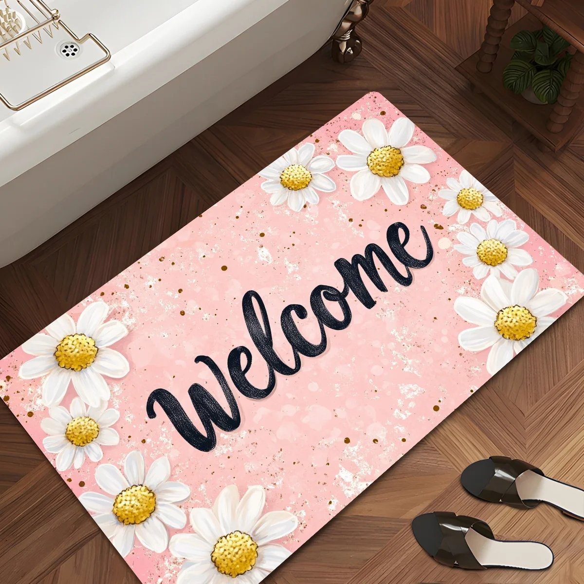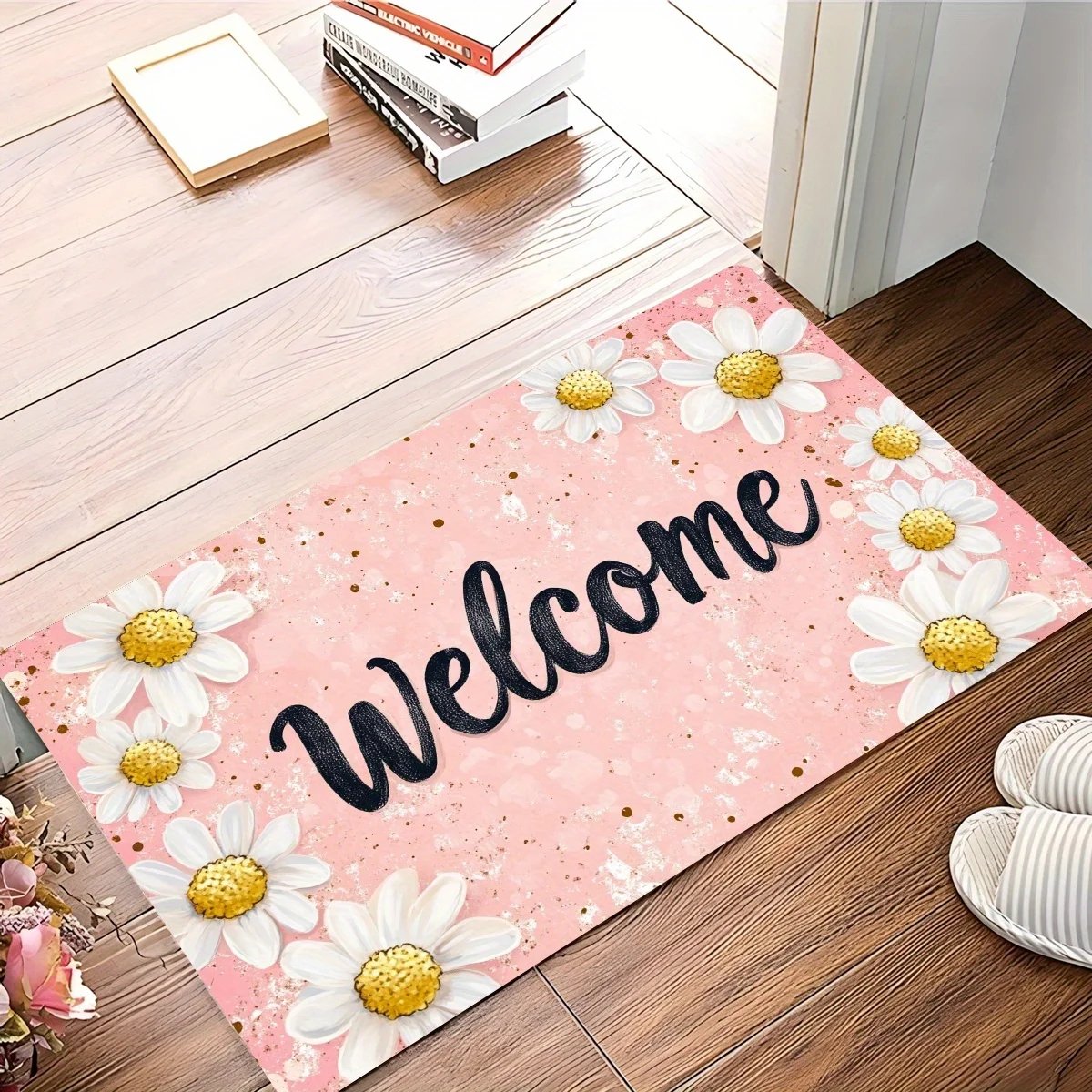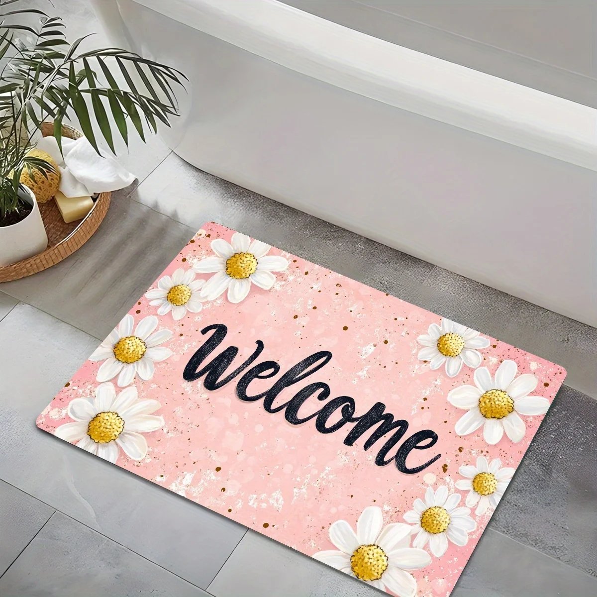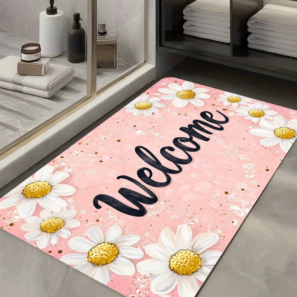 1pc Welcome Daisy Pattern Floor Mat, Polyester Fabric, Machine Washable, Suitable for Bedroom Living Room Decoration