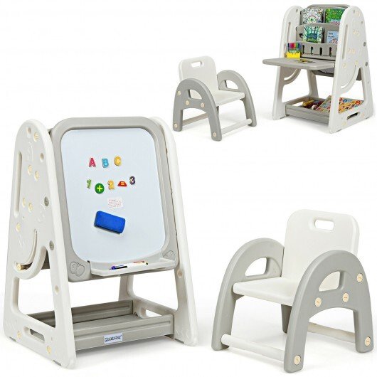 2-in-1 Kids Easel Desk Chair Set Book Rack Adjustable Art Painting Board-Gray – Color: Gray