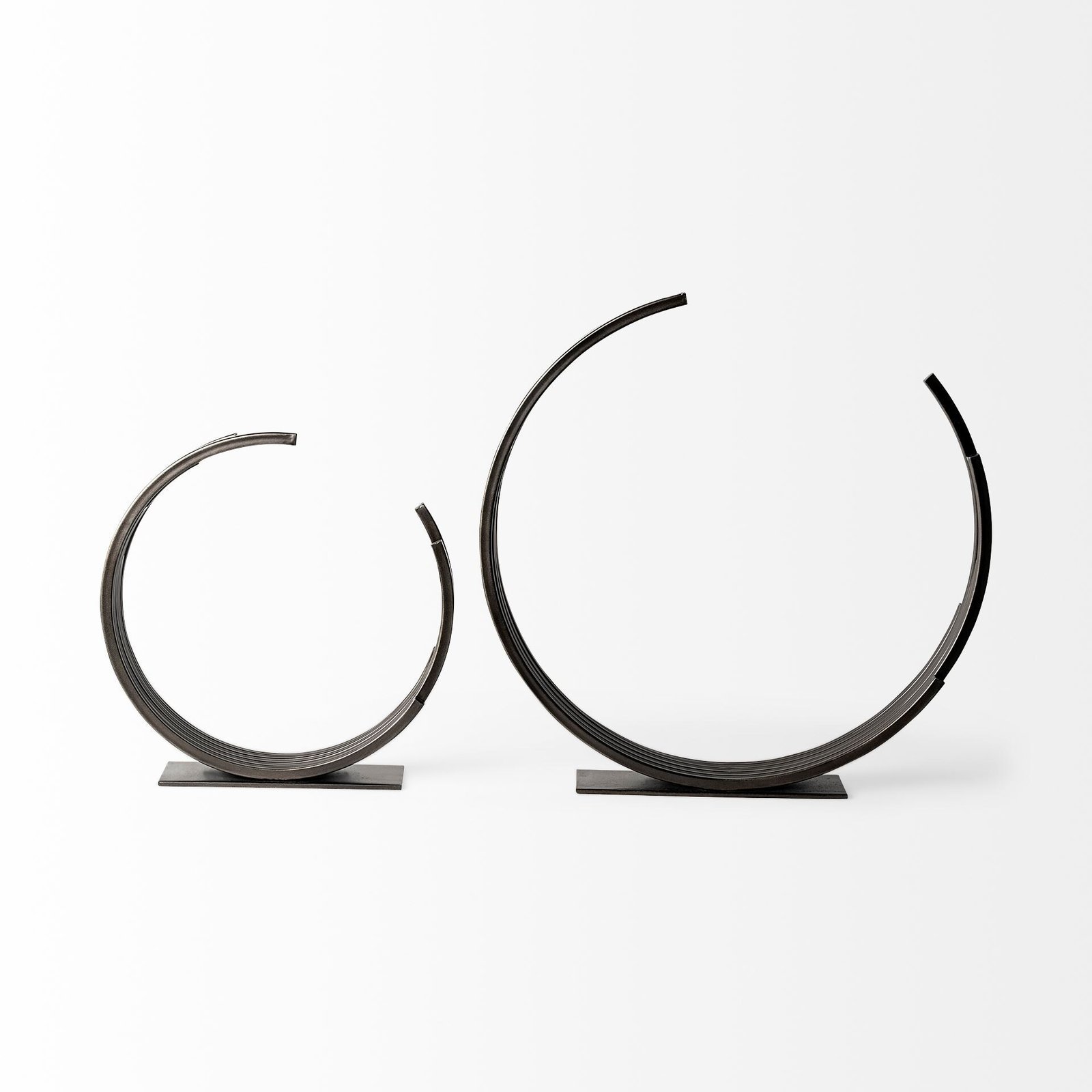 Unique and decorative, this 20-inch black iron modern abstract tabletop sculpture will leave a lasting impression. This piece is made from solid iron and has a matte black finish on it. There is a thin rectangular base which holds the main body of this sculpture in place. The main body is made up of thin metal rods that are set in an incomplete, purposefully broken circular shape. These metal rods have different sizes which gives a sense of movement and texture to this whole piece. This decor piece has a very art-inspired look and will elevate any space you use it in. 20.1-inch H x 20.5-inch W x 3.1-inch D