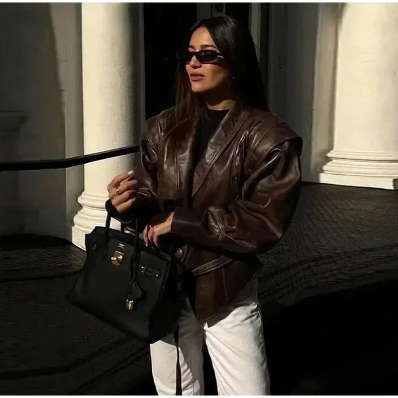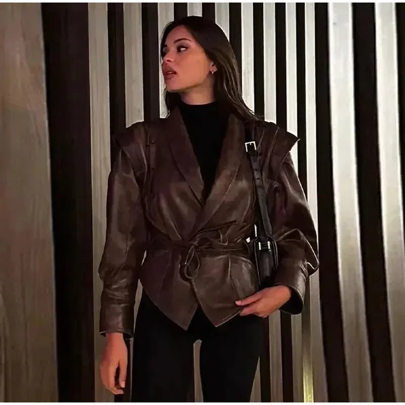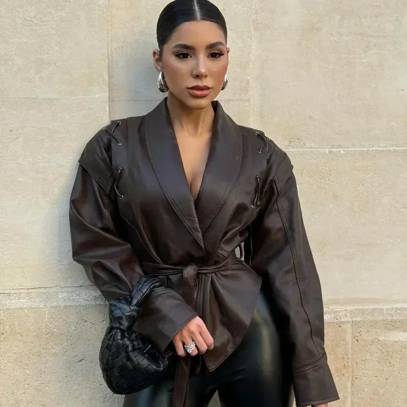 2024 Fashion Women Vintage Faux Leather Jacket V Neck Long Sleeve Warm Short Lace Up Coats Autumn Female High Street Outerwear