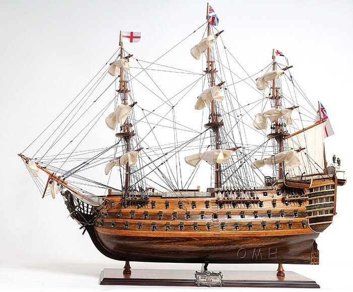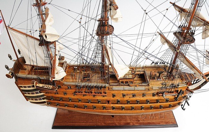 Magnificent and incredibly detailed replica, the HMS Victory Medium Ship Model is a unique hand-built model of the legendary British Navy flagship commanded by Lord Nelson at the Battle of Trafalgar. Handmade by the most talented craftsman using high-quality western red cedar, rosewood, and mahogany. It features three large masts, and incredible details as captains sleeping and dining cabin, authentic handmade lifeboats and an exquisitely detailed admirals quarter. It comes with a solid wood base and a brass nameplate making it perfect for displaying. With its distinctive design, it is a sought-after piece for any history or maritime enthusiast. 27″ H x 30″ W x 10″ D