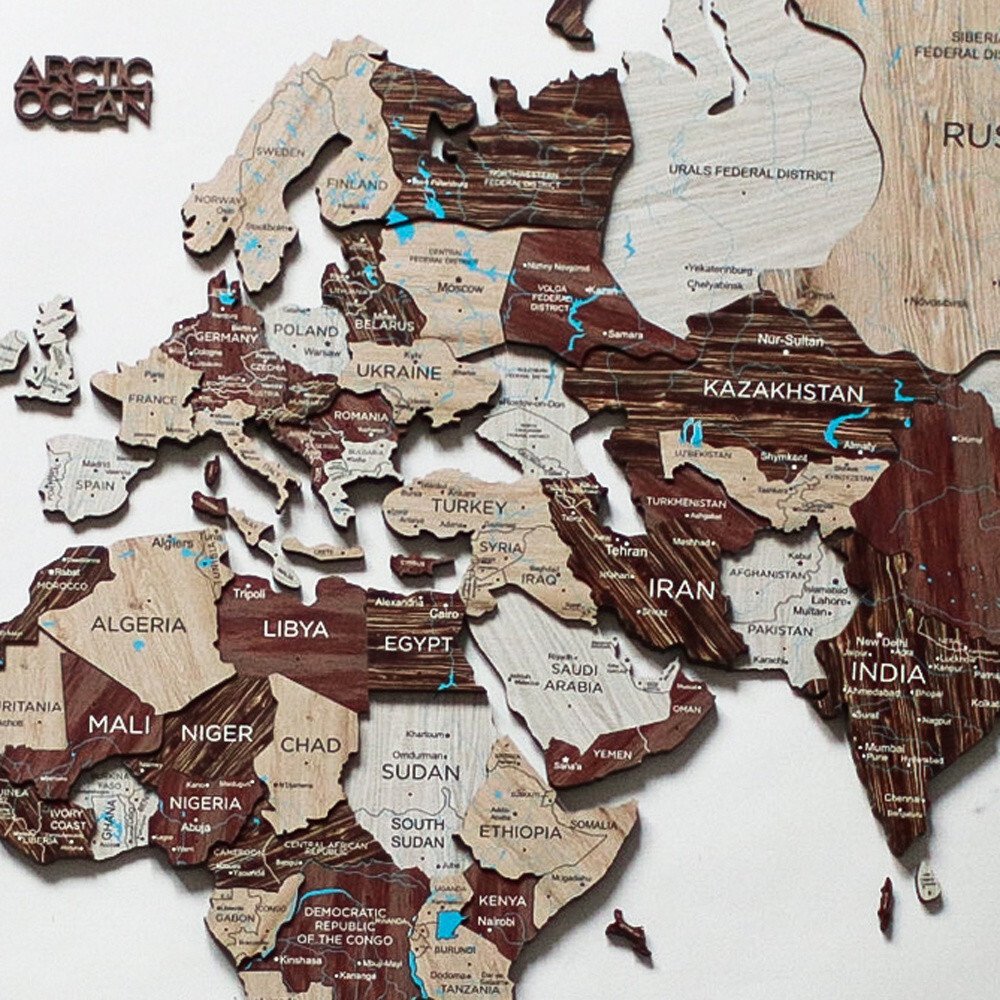 Add an air of fashion to your room and rejuvenate the space with this 35-inch x 59-inch brown and beige wood world map hanging dimensional sculpture. Handcrafted plywood pieces are used to create this eye catching array that will add color and dimension to your walls and surely be a conversation starter. Utilize this opportunity to create a focal point in the room with this unique and fabulous large scale wall decor option. 35-inch H x 59-inch W x 0.47-inch D