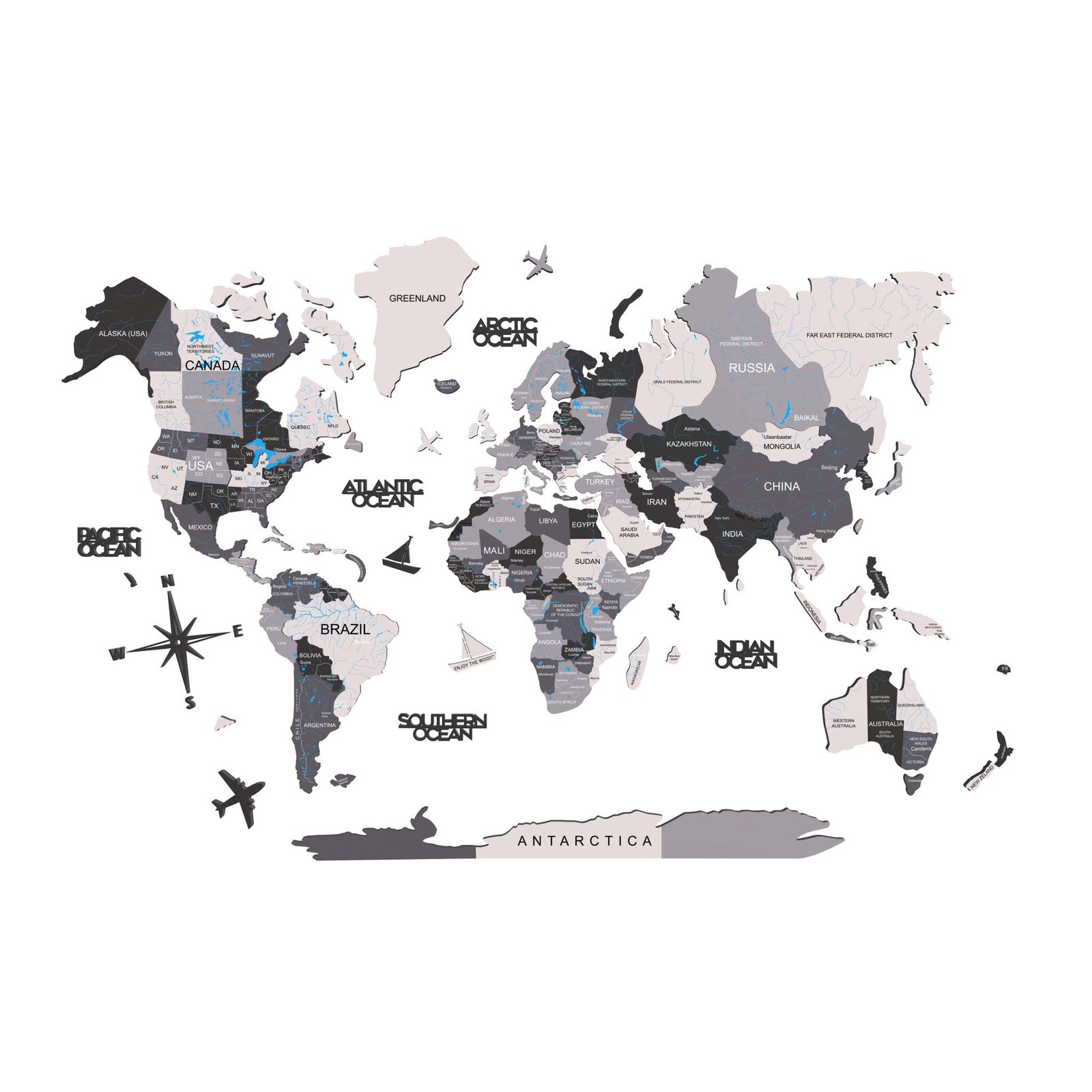 24″ X 39″ Black Gray and White Wood World Map Hanging Dimensional Sculpture