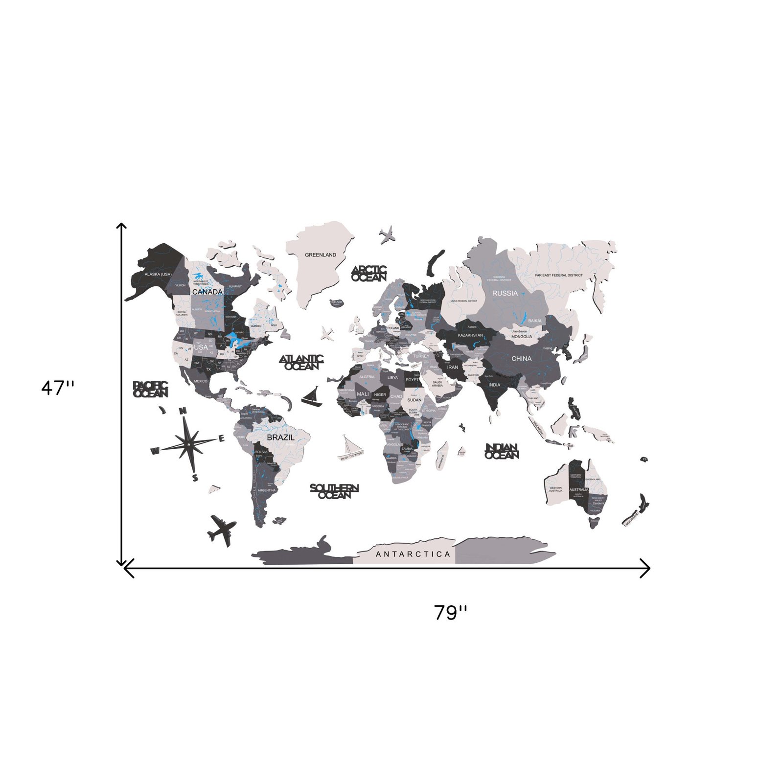 The 47-inch x 79-inch black gray and white wood hanging dimensional world map sculpture wall decor is the perfect decorative accessory for your home. Handcrafted plywood pieces are used to create this eye catching array that will add color and dimension to your walls and surely be a conversation starter. Utilize this opportunity to create a focal point in the room with this unique and fabulous large scale wall decor option. 47-inch H x 79-inch W x 0.47-inch D