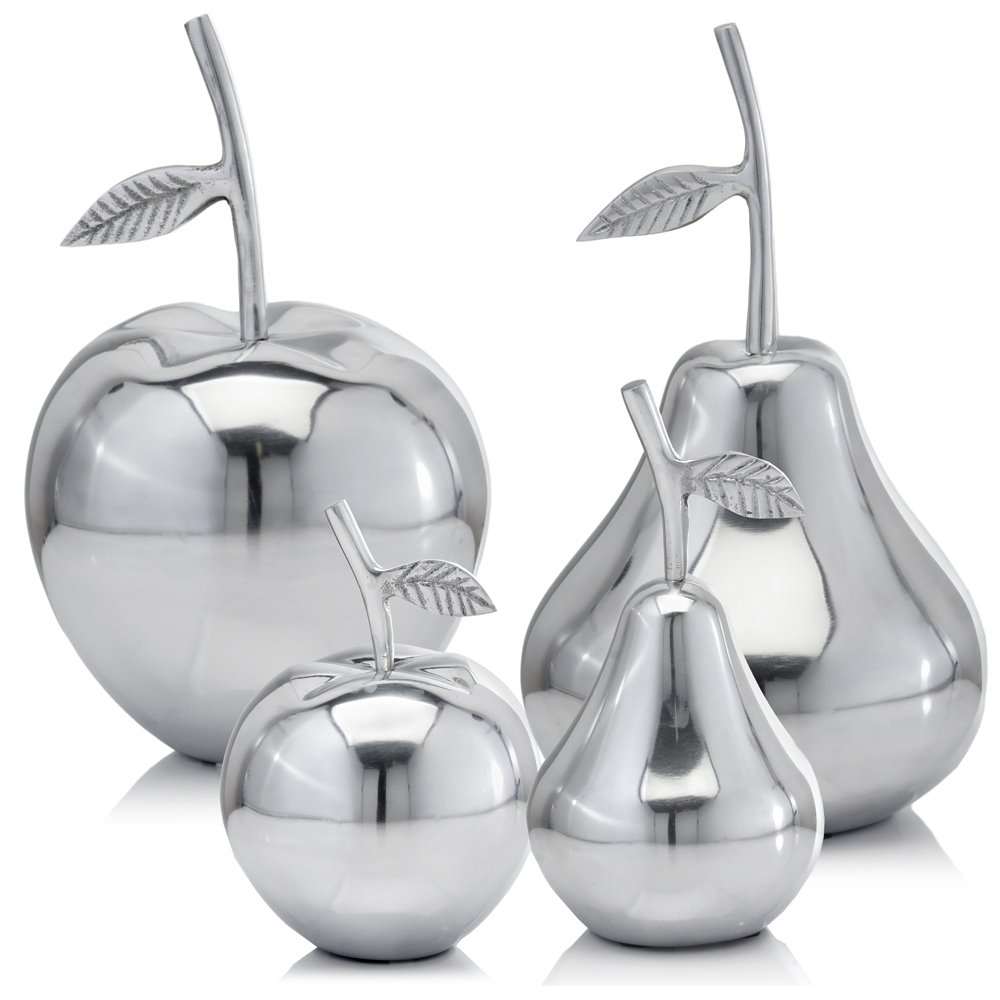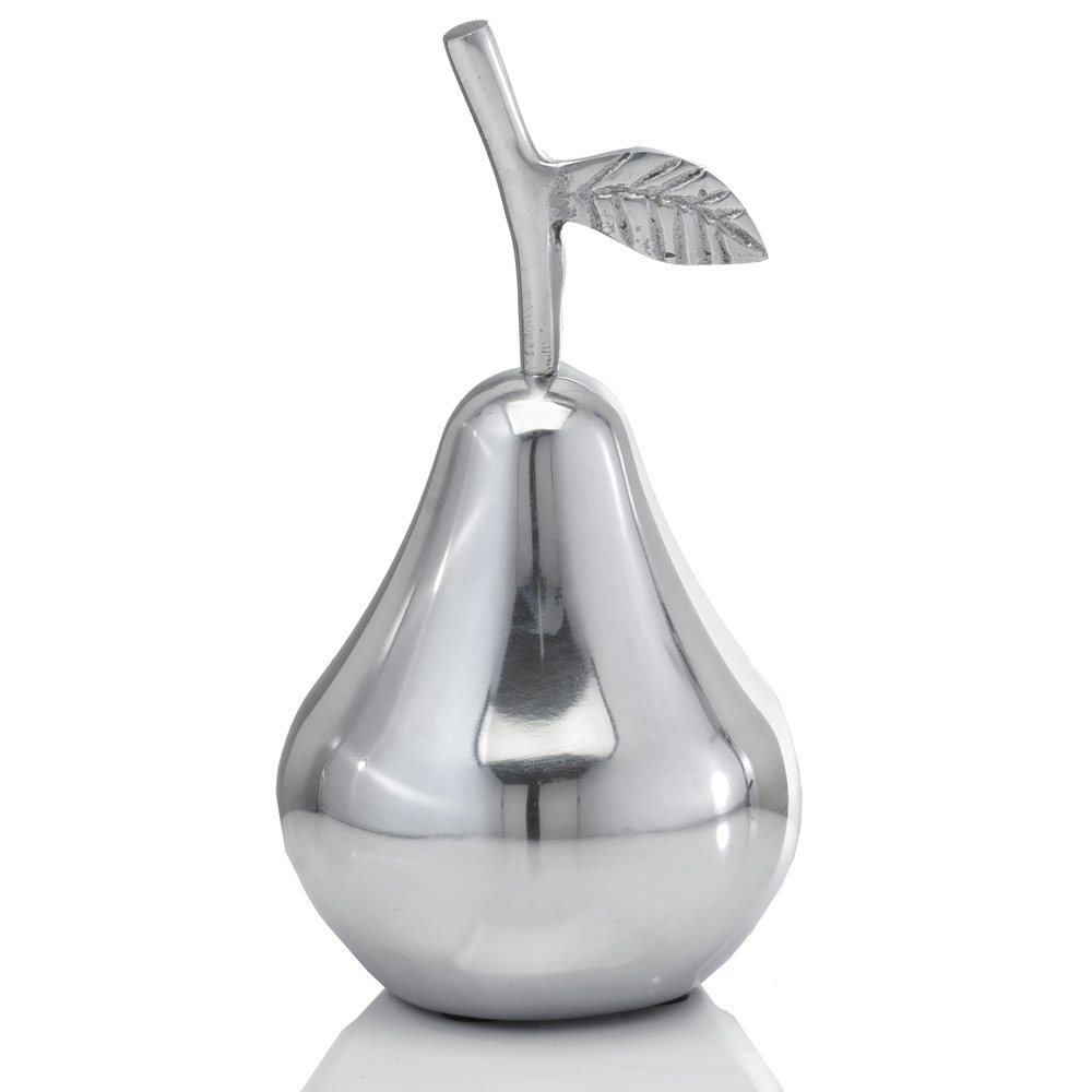 This decorative pear sculpture exudes a touch of modern elegance with its sleek silver color and high-grade buffed aluminum material. Its contemporary style makes it a versatile accent piece for any modern home decor, adding a stylish touch to your space. The unique pear shape adds a whimsical charm to your living room or office, making it a conversation starter among guests. Crafted with attention to detail, this sculpture is a perfect choice for those seeking a chic and sophisticated decorative element to enhance their interior design. 6.5-inch H x 4-inch W x 4-inch D