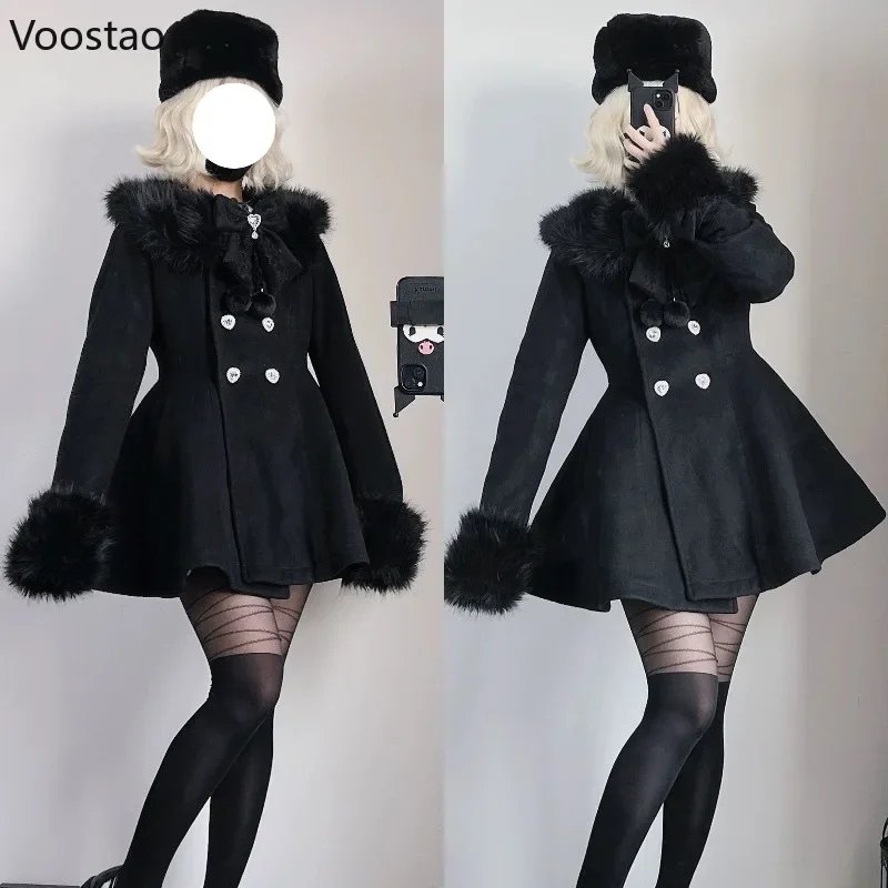 Autumn Winter Japanese Kawaii Lolita Woolen Coat Women Sweet Bow Plush Slim Jacket Female Korean Style Warm Dress Cute Overcoat