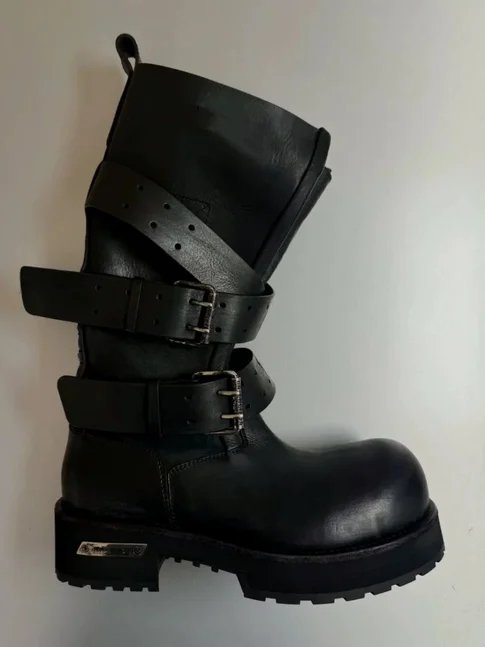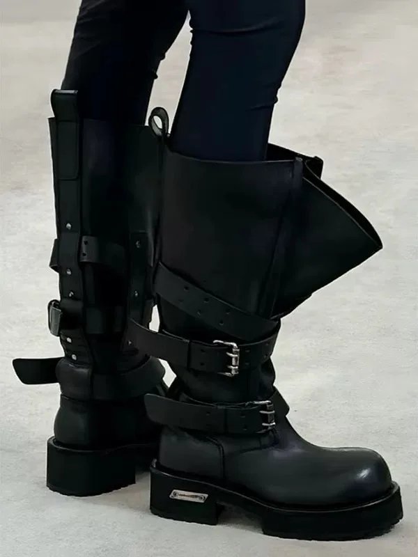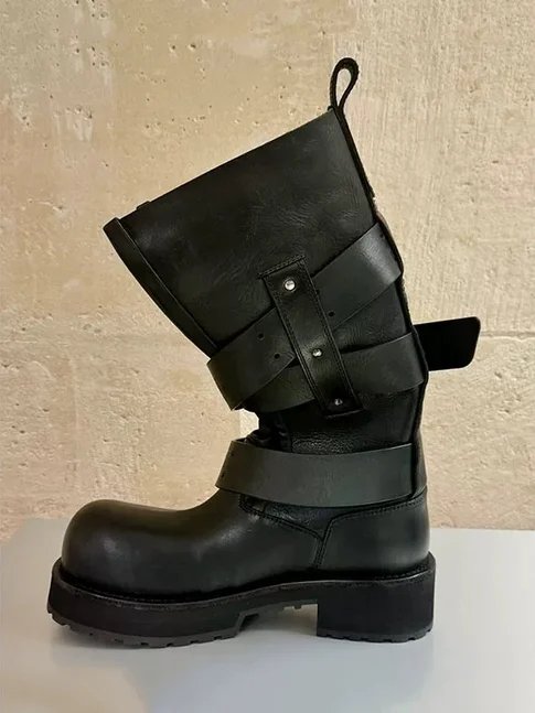 Big Round Toe Flats Black Leather Boots Women's 2025 New in Buckled in Venom Boots Luxury Designer Big Size Soft Shoes