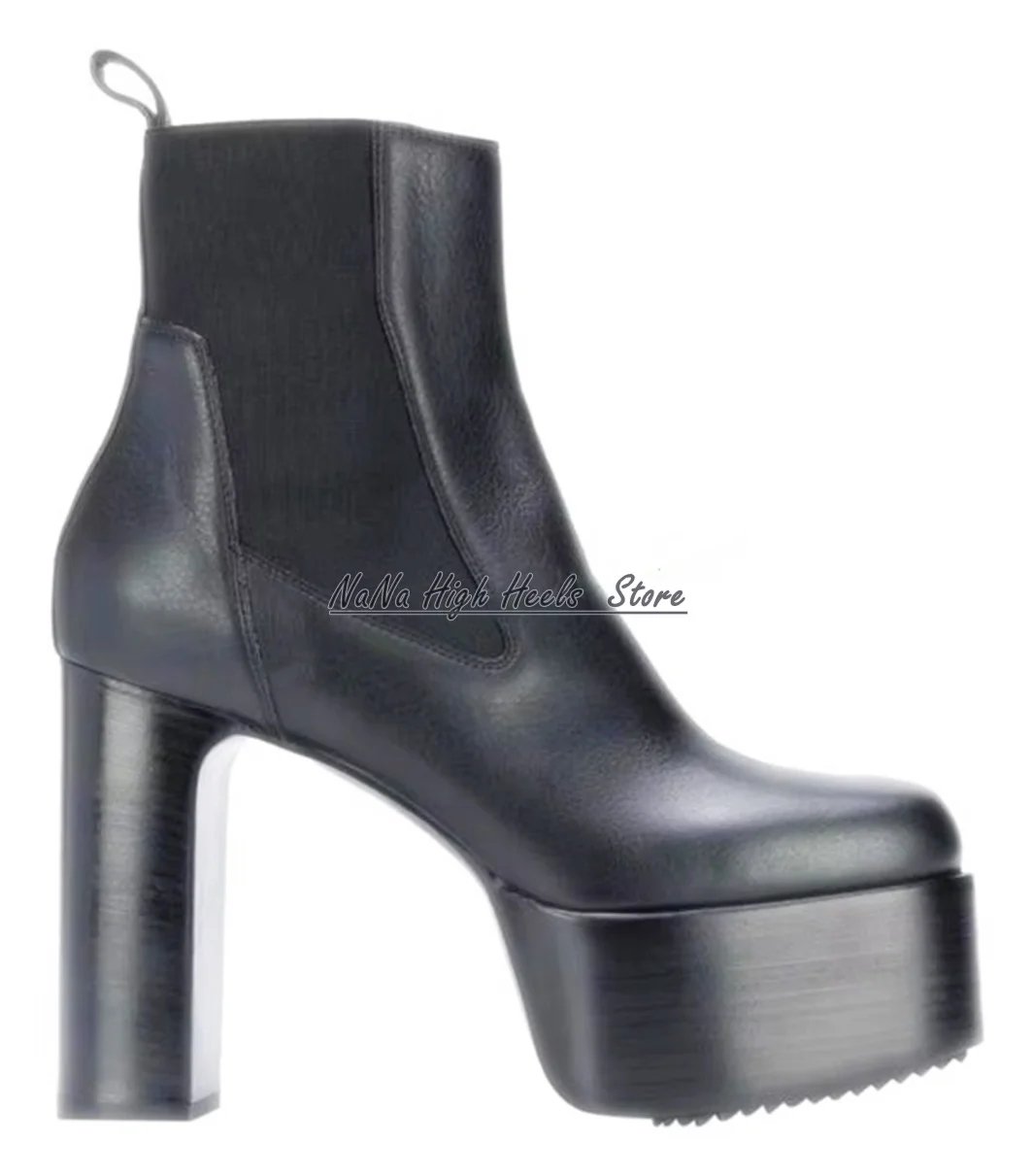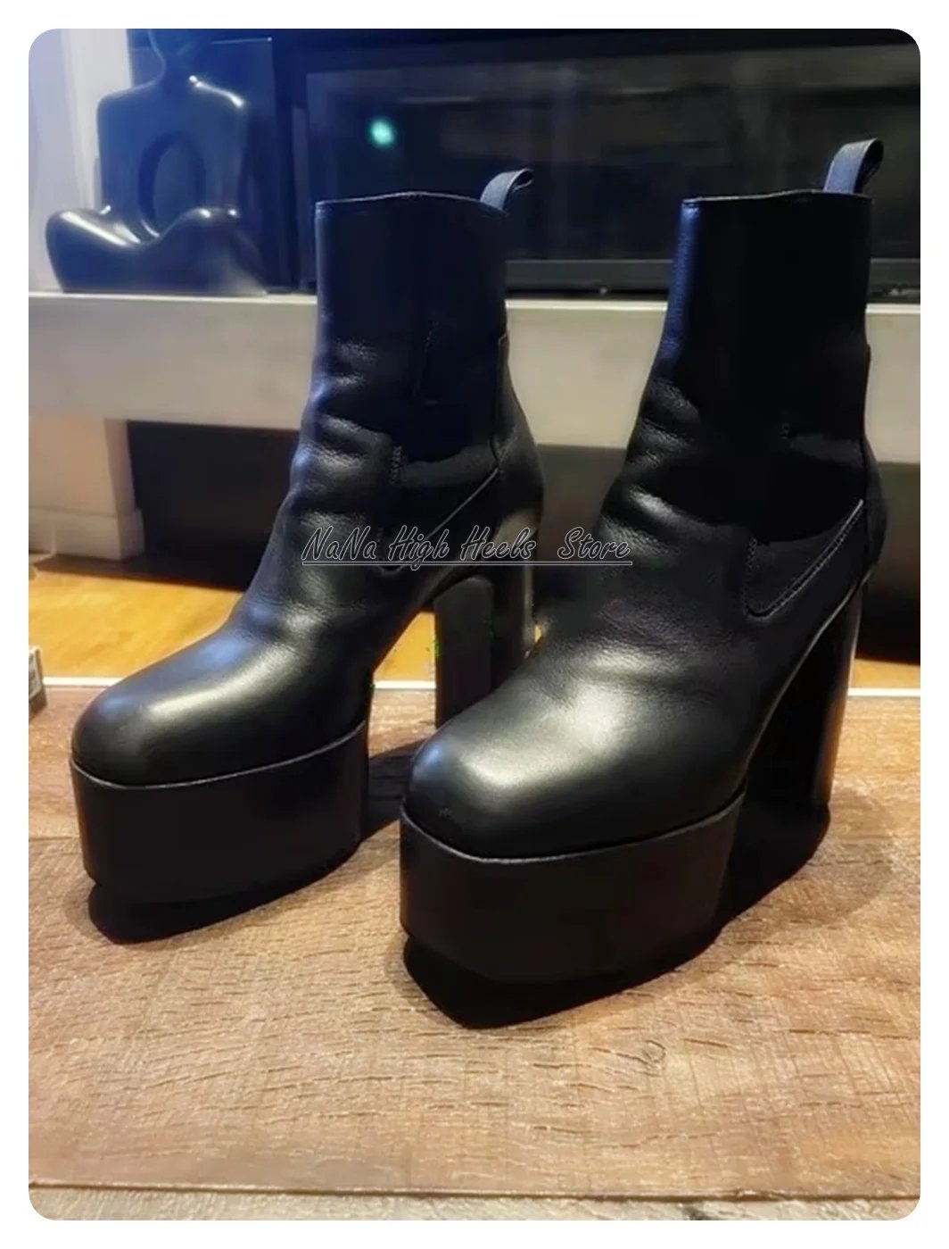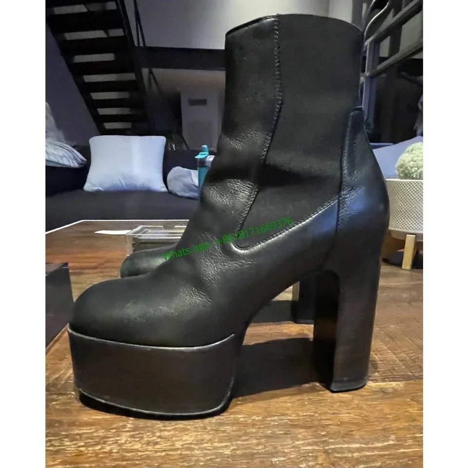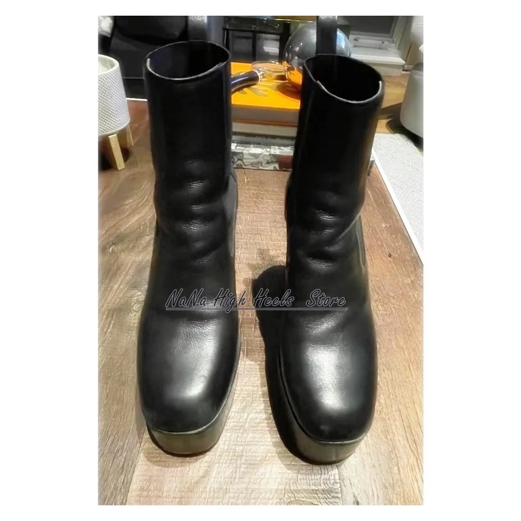 Black Round Toe Block Knee High Boots Fall Sexy Luxury Women Kiss Mid-Calf Leather Platform Motorcycle Boots Fashion Lady Shoes