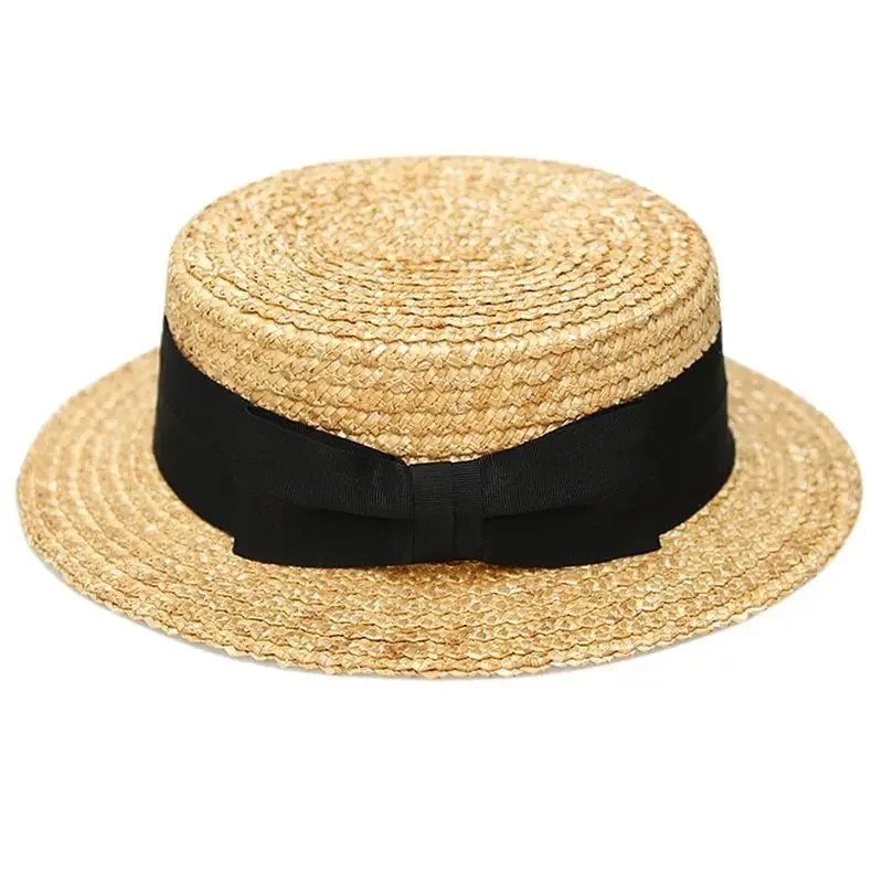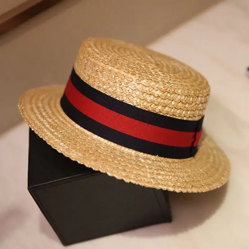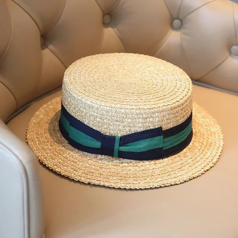 British striped natural straw hat European and American film flat top flat eave straw hat casual short eave unisex movie hat