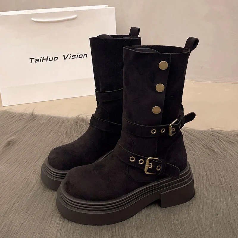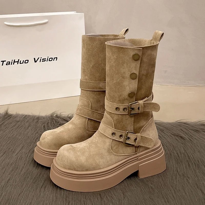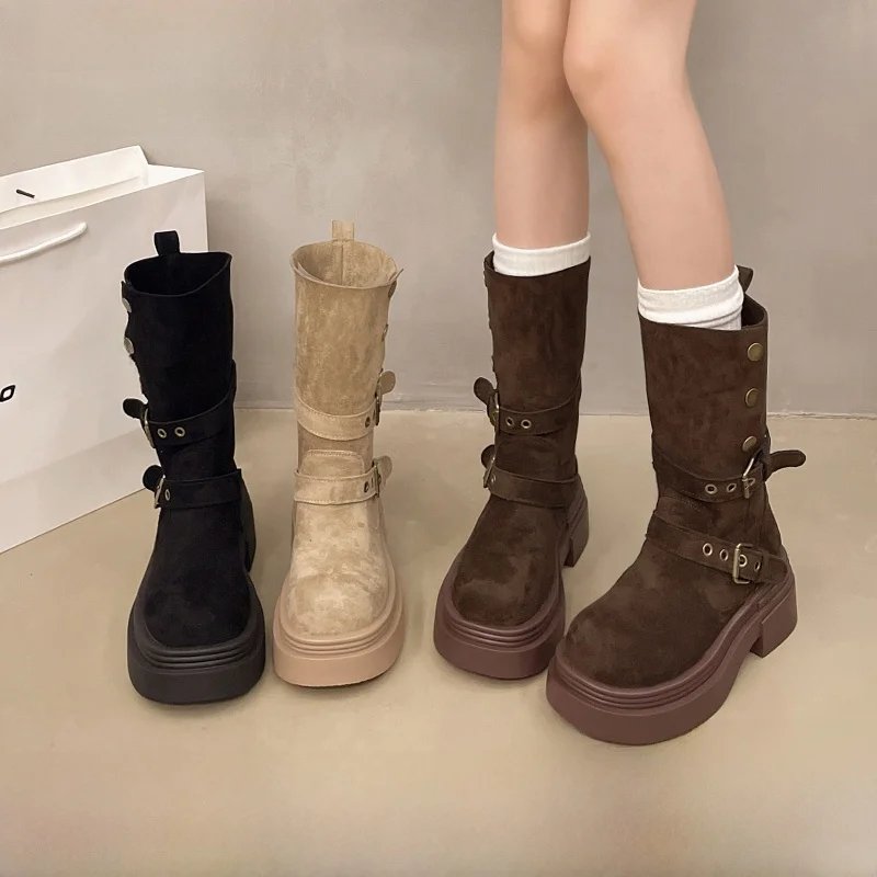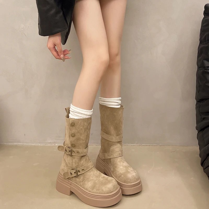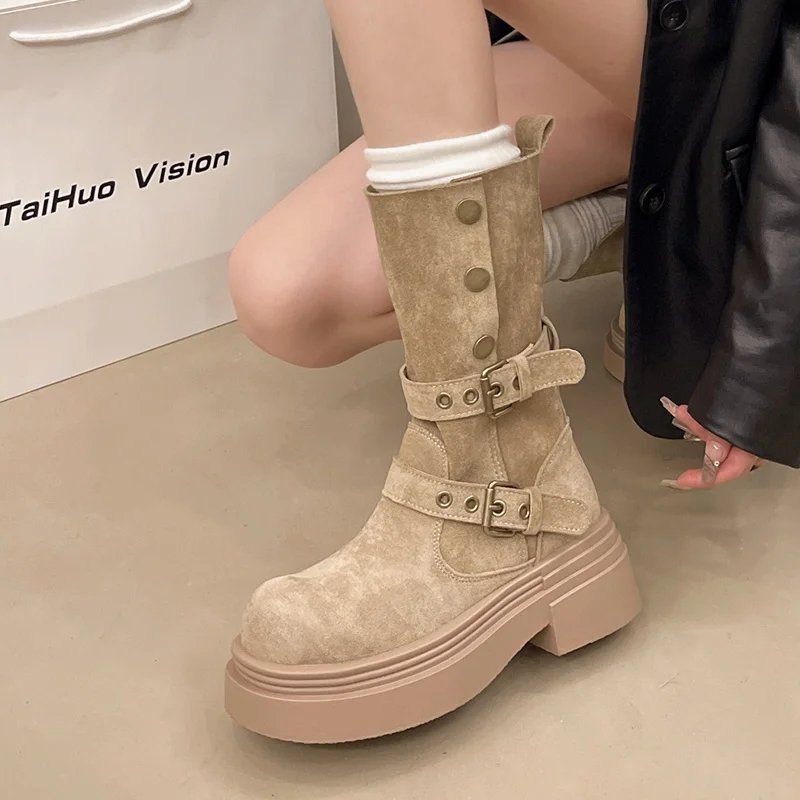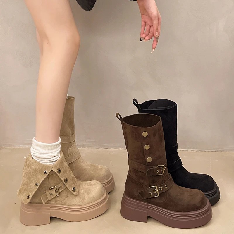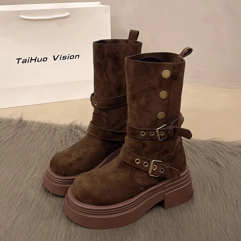 Brown Thi Bot Mid-Calf Women's Boots Spring Autumn Two-Way Wear Heightening ort Boots Casual Faion Boots