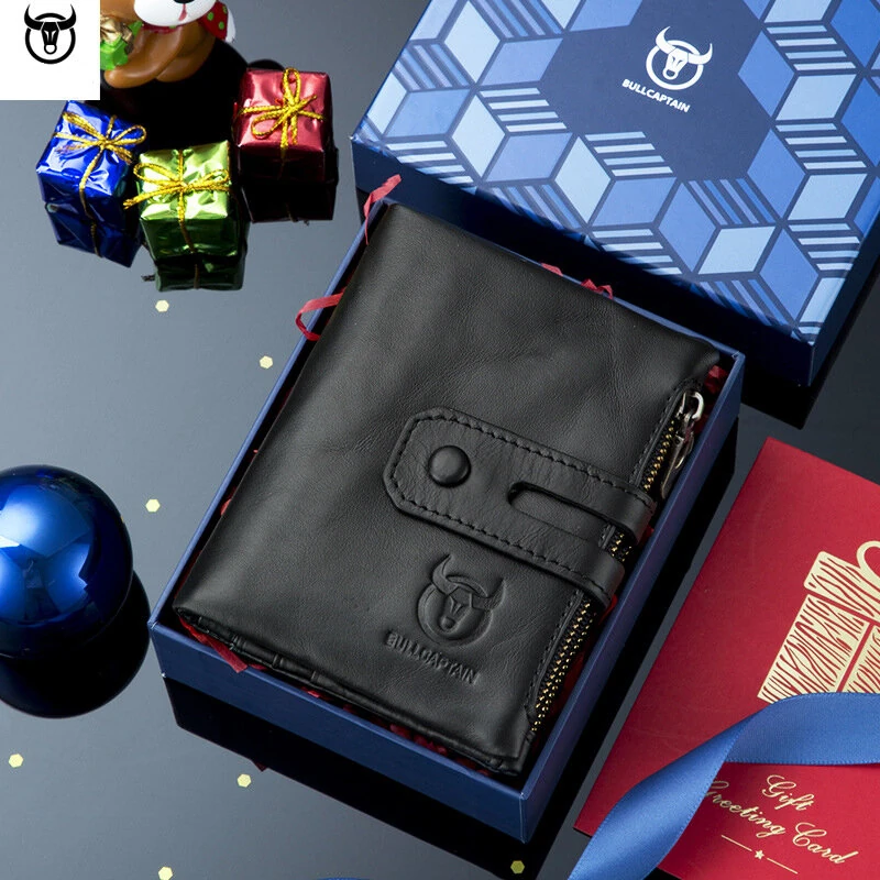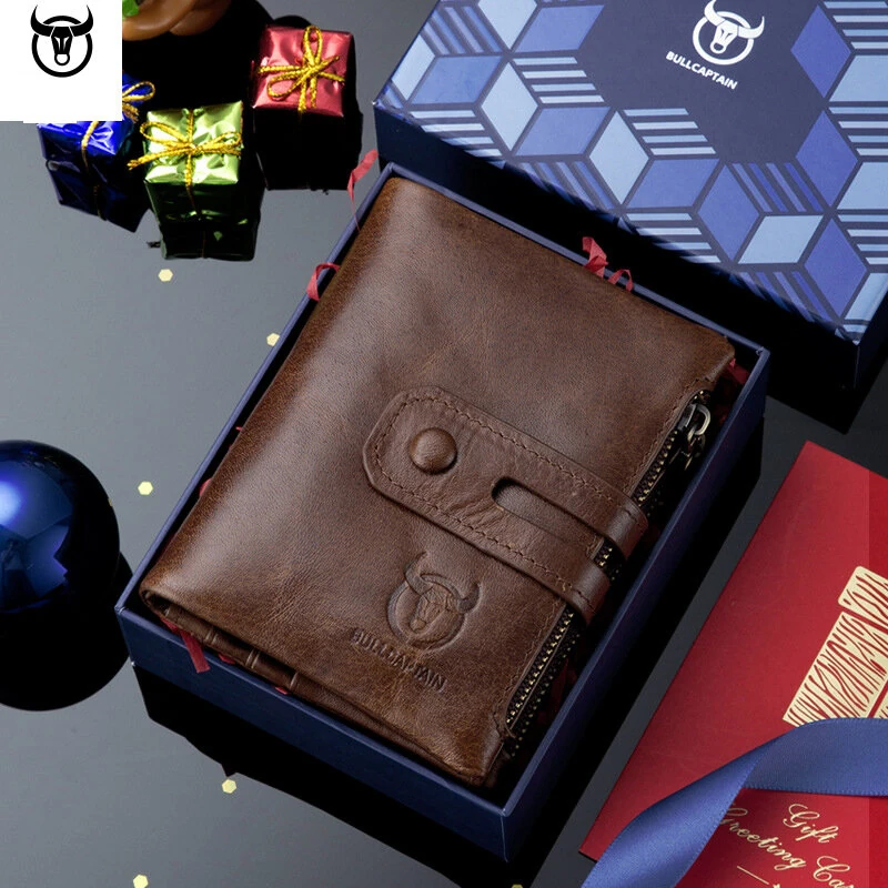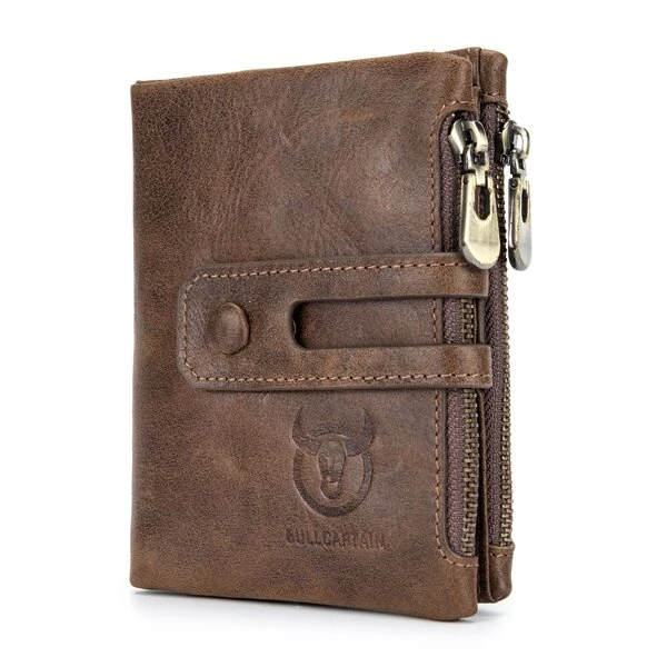 BULLCAPTAIN Mens Retro Genuine Leather Wallet RFID Anti-thef Multicard Slot Wallet Card Holder Double Zipper Coin Purse Cowhide Leather Wallet