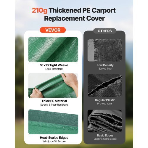Item Material: 210g PE Woven Fabric,Leg Skirts: 4 pcs, 4.0 × 1.95 m/ 13.12 × 6.4 ft,Item Model Number: SXYQCPBL10X20,Weave Dimensions:6.09 × 3.0 m / 19.98 × 9.84 ft,Grommet Spacing: One every 0.6 m,with double-layer heat-sealed seams,Elastic Ball Cords: 44pcs,Product Dimensions: 6.09 × 3.05 × 2.87 m / 19.98 × 10.01 × 9.42ft,Net Weight: 13.45 lbs / 6.1 kg