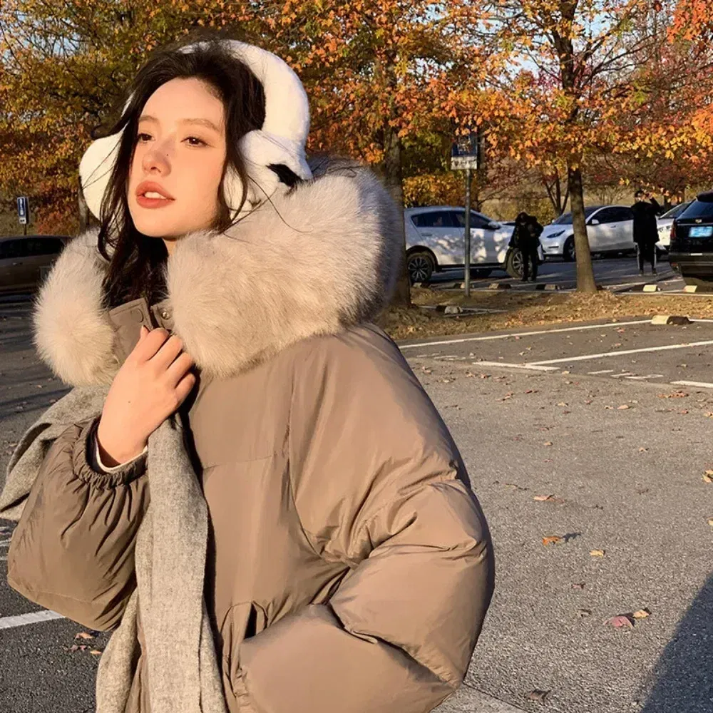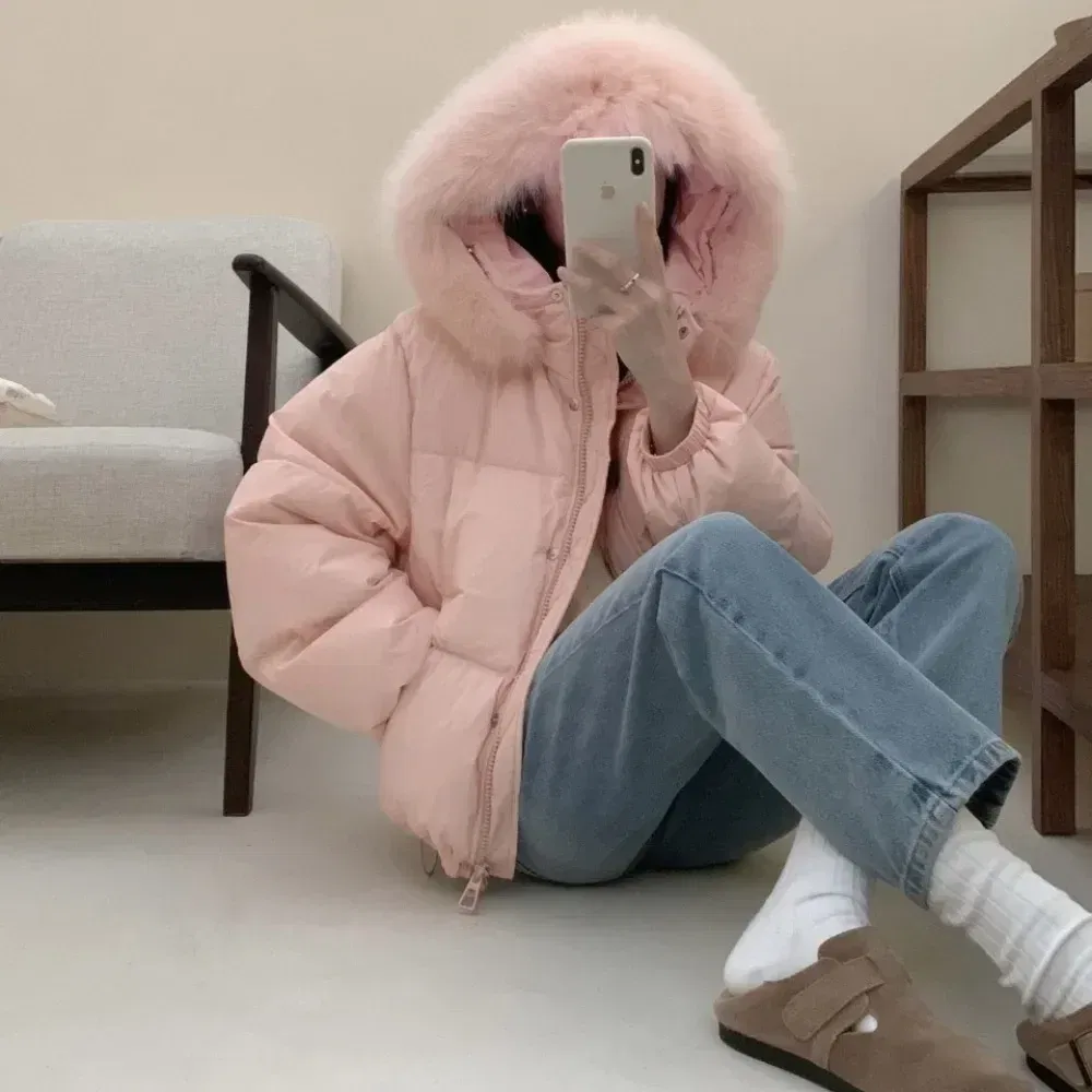 Color: black, Size: M – Short Loose Coat 2024 Winter New Fashion White Duck Down Coat for Women Down Coat Real Big Fur Collar Hooded Coat for Women