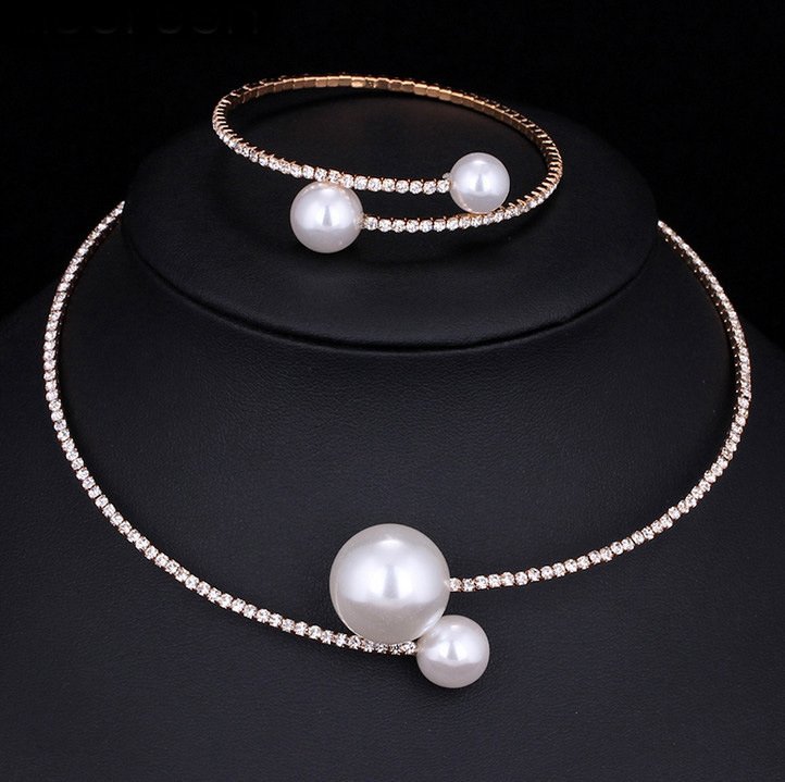 Color: Gold, style: 2 pieces – The bride wedding accessories crystal pearl diamond drill collar Necklace Bracelet Adjustable two piece suit