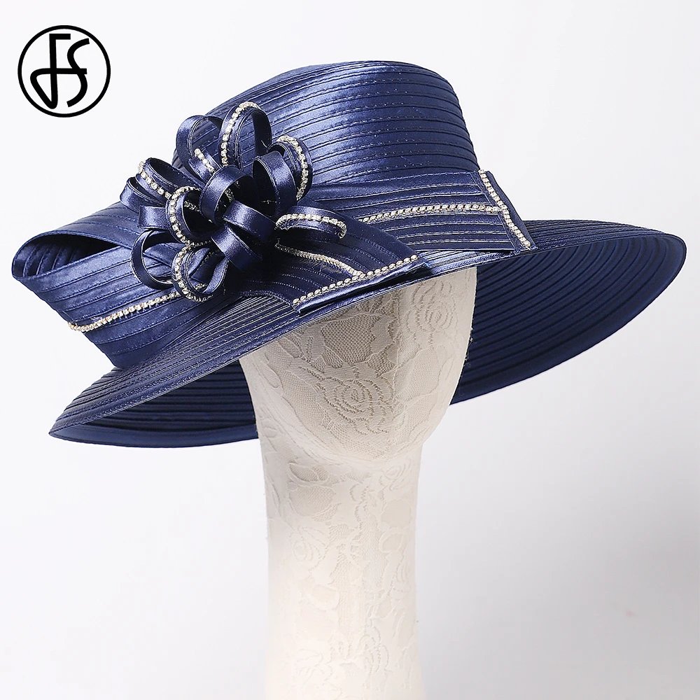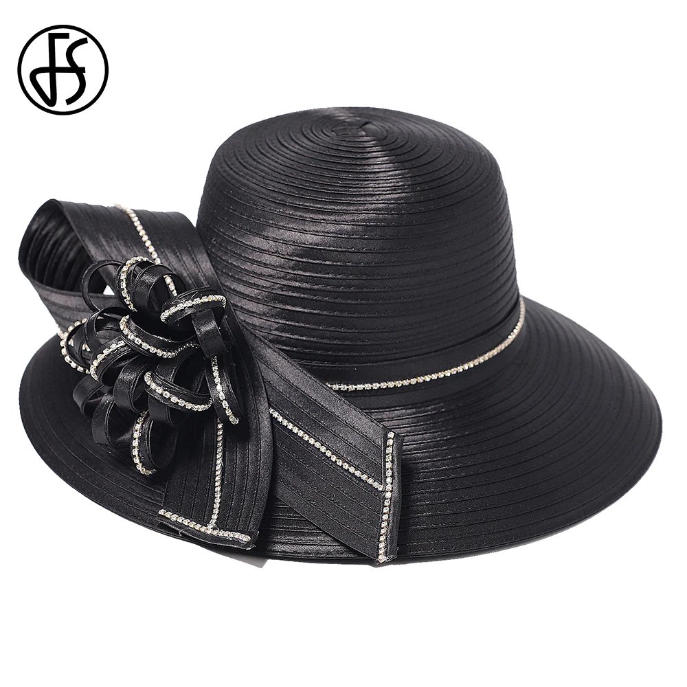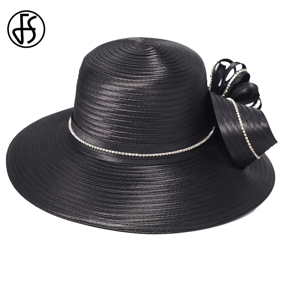 FS Elegant Black Hat Lady Formal Dress Fedora Church Cocktail Tea Party Derby Caps For Women Bow Flower Wide Brim Cloche Hats