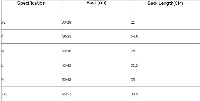 Size: XS: chest circumference 28cm [recommended 0.50kg-1.50kg],S: chest circumference 33cm [recommended 1.50kg-2.50kg],M: chest circumference 38cm [recommend 2.50kg-3.50kg],L: chest circumference 43cm [recommend 3.50kg-4.50kg],XL: chest circumference 48cm [recommend 4.50kg-5.50kg],2XL: chest circumference 53cm [recommended 5.50 kg-6.50kg]]