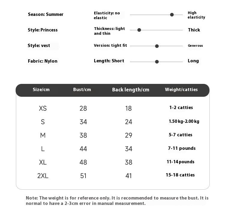 Size: XS size chest 28 back 18 (0.50kg-1.00kg,S size chest 34 back 24 (1.50kg-2.00kg,M size chest 38 back 29 (2.50kg-3.50kg,L size chest 44 back 34 (3.50kg-5.50kg,XL size chest 48 back 38 (5.50kg-7.00kg,2XL size chest 51 back 41 (7.50 kg-9.00kg