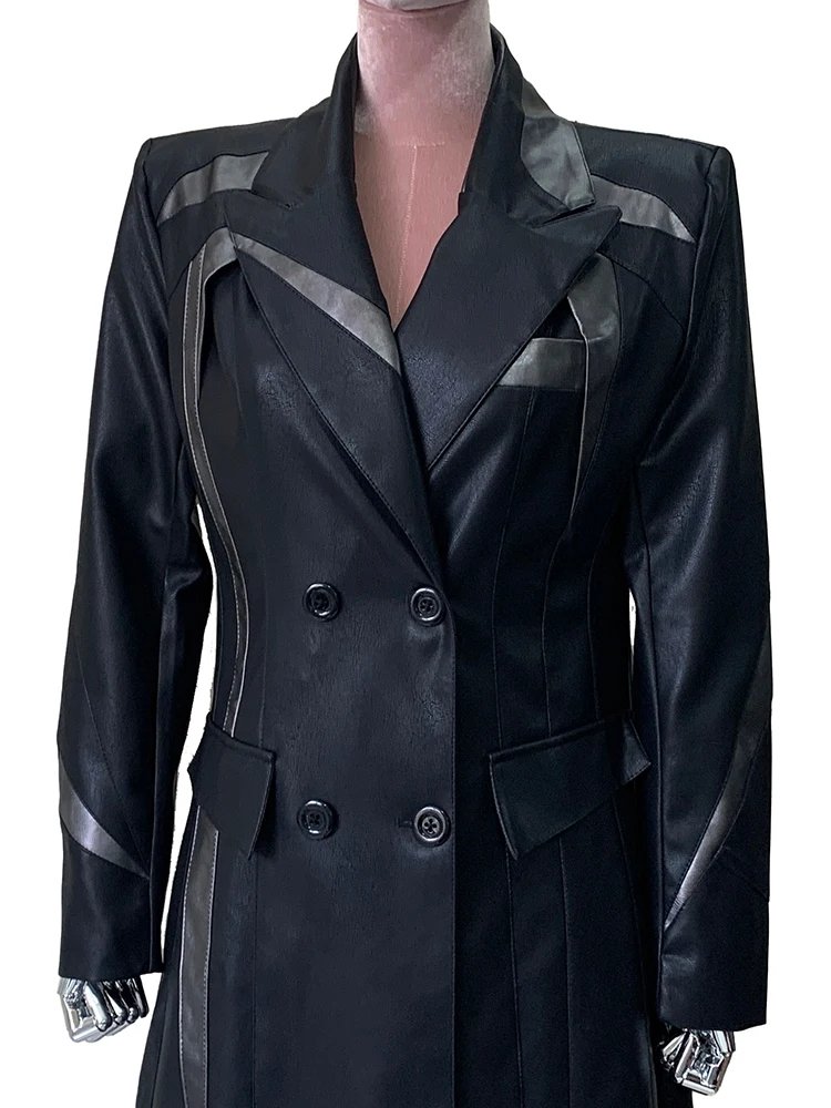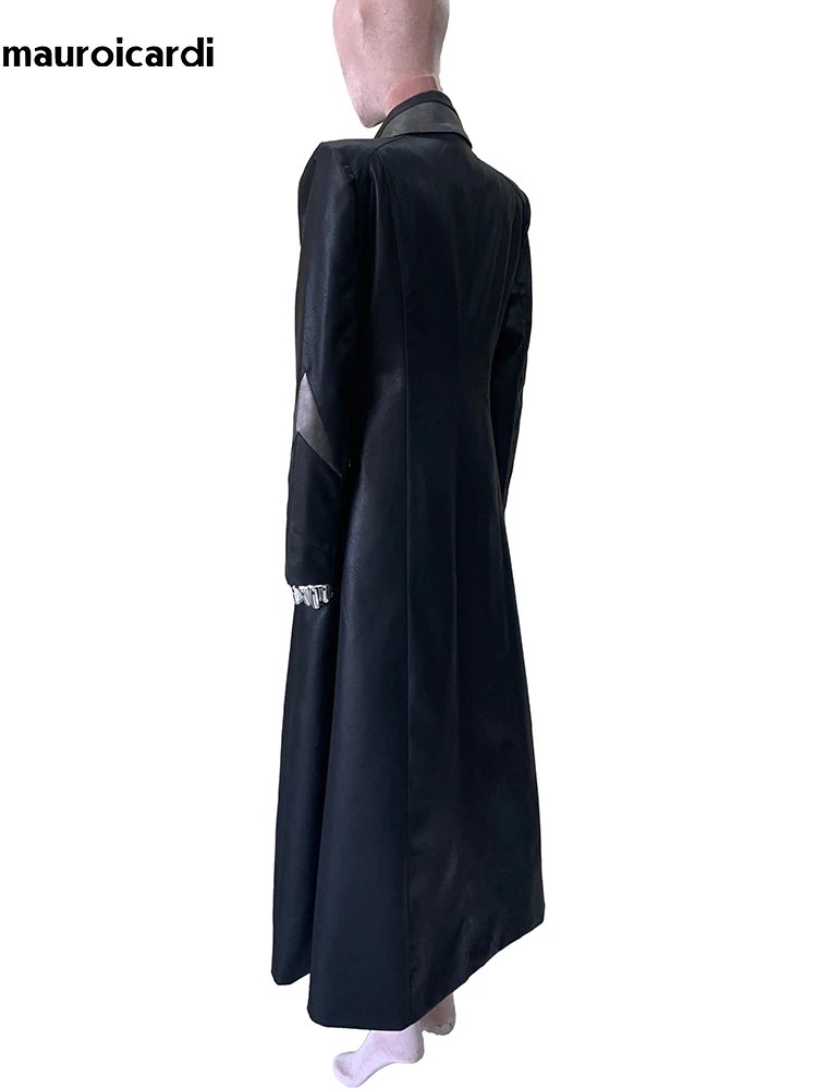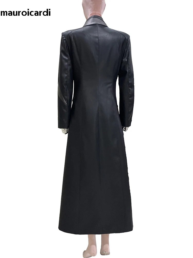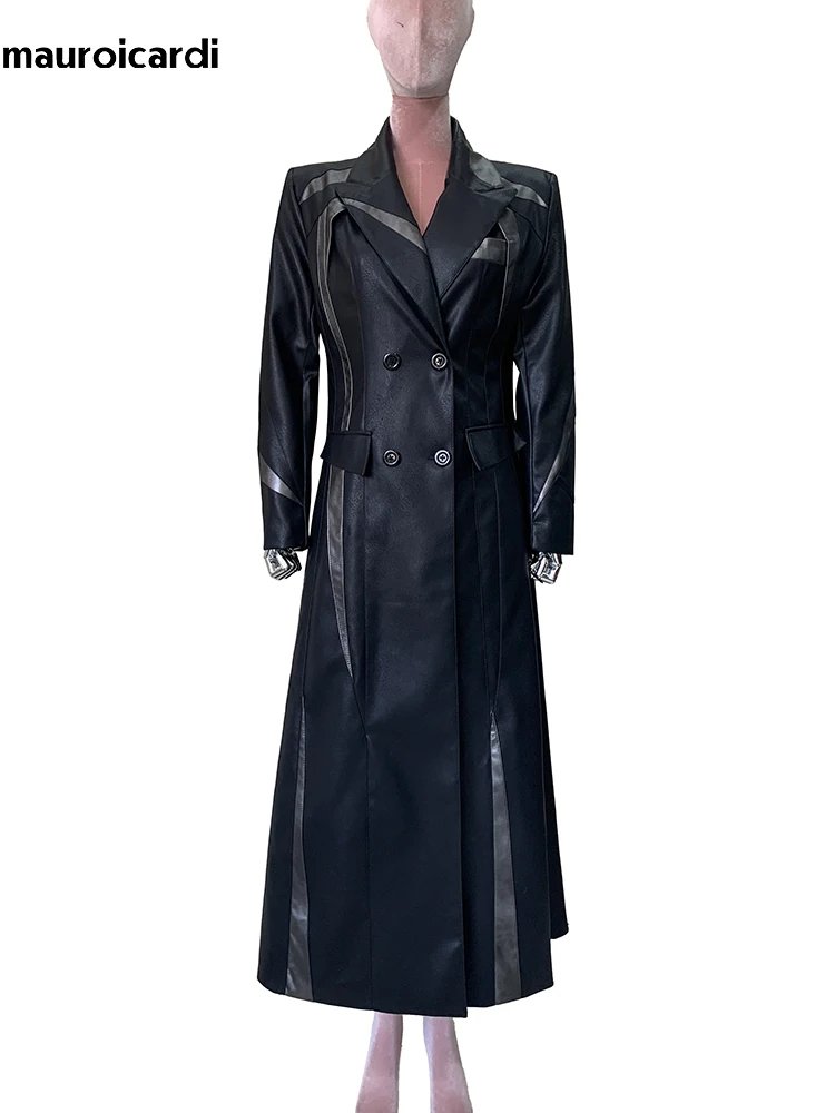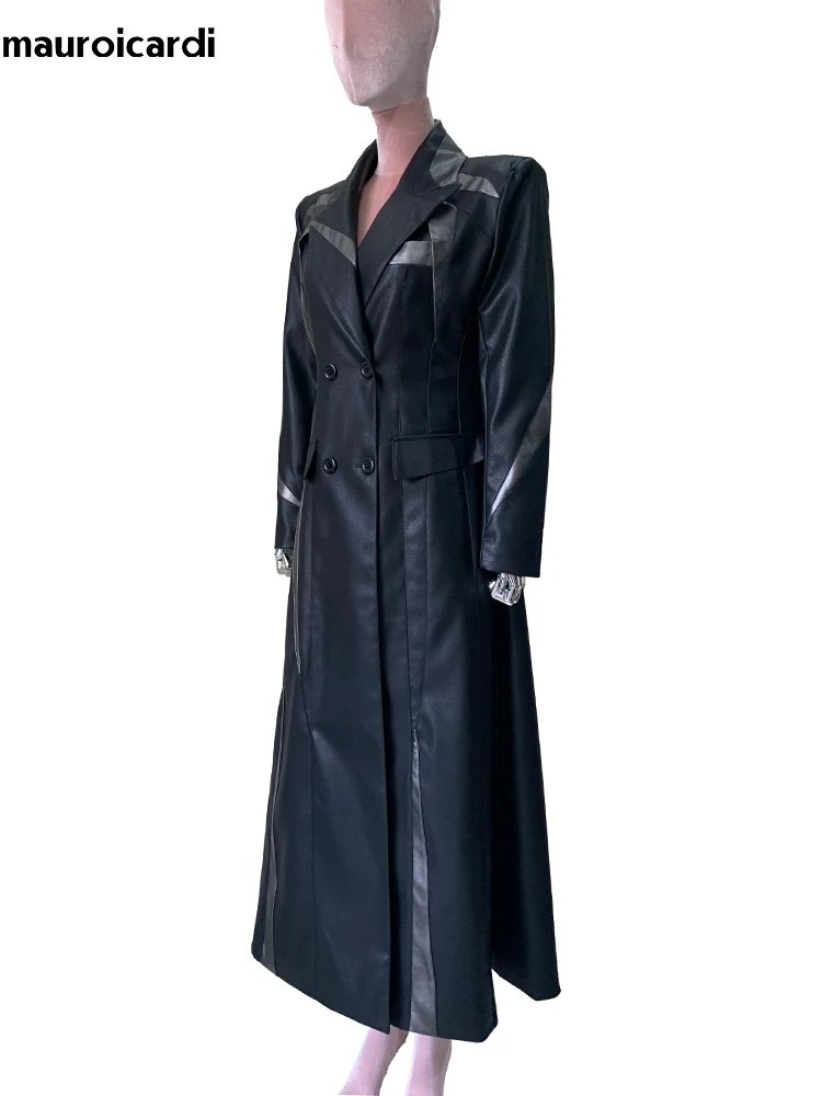 Mauroicardi Spring Autumn Extra Long Fitted Patchwork Pu Leather Coat Women Shoulder Pads Runway European Fashion Overcoat 2025