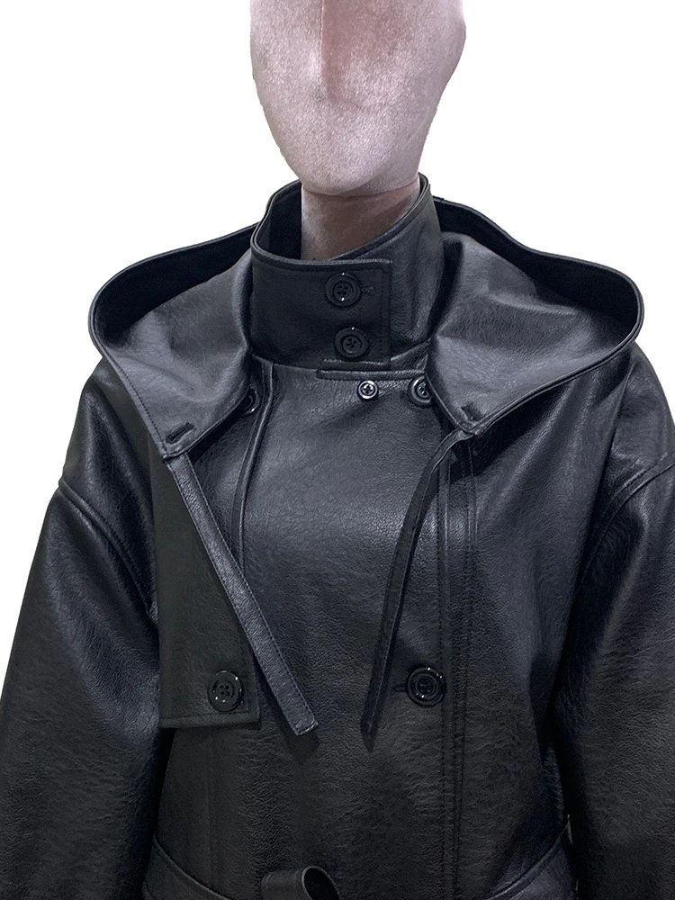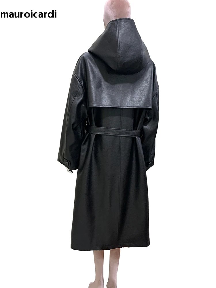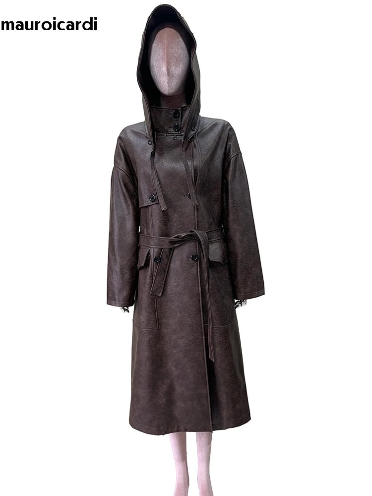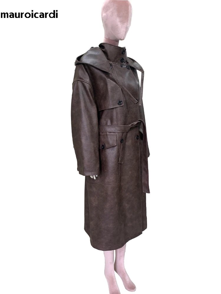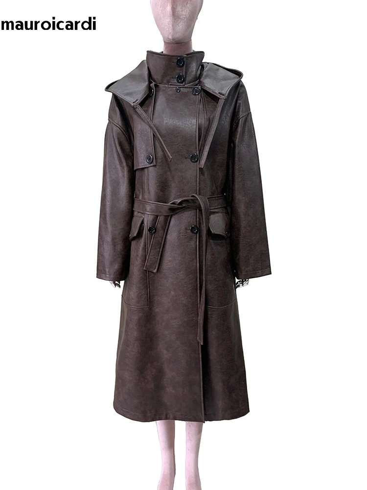Mauroicardi Spring Autumn Long Waterproof Hard Brown Pu Leather Coat Women with Hood Double Breasted Loose Cause Korean Fashion