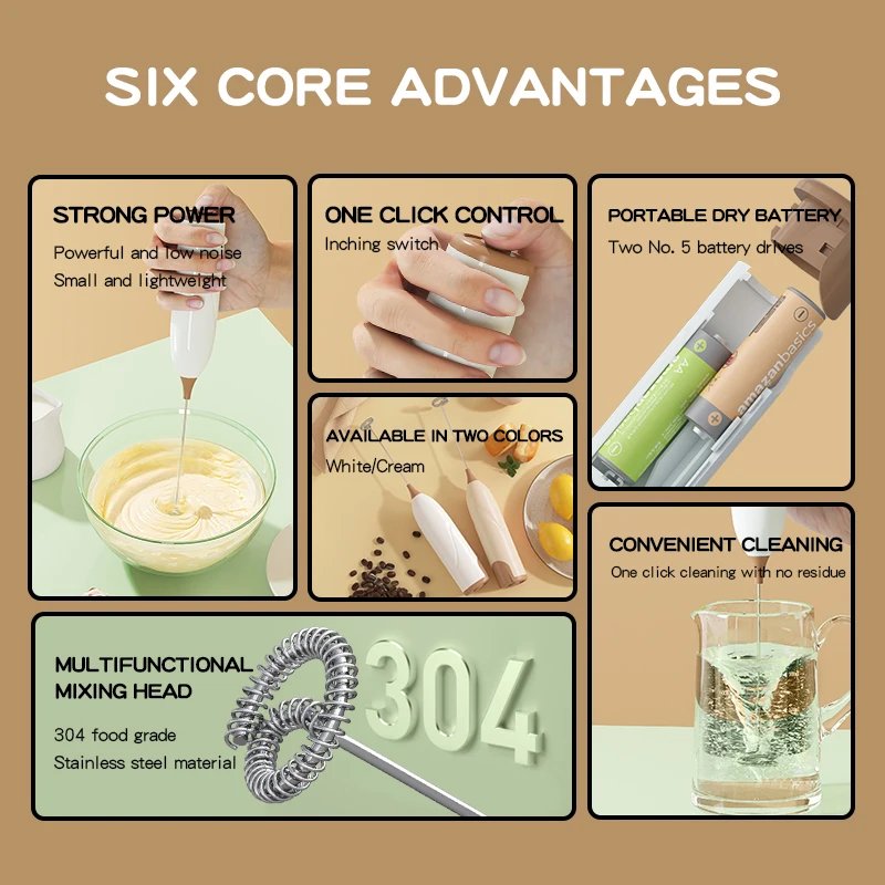 Milk Frother Handkeld Electric Foam Maker Battery Operated Stainless Steel Whisk Drink Mixer for Latte Cappuccino Hot Chocolate
