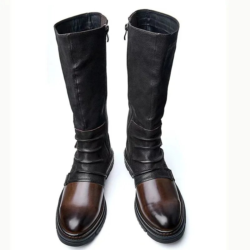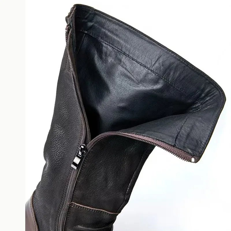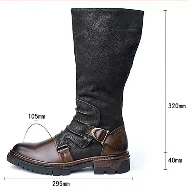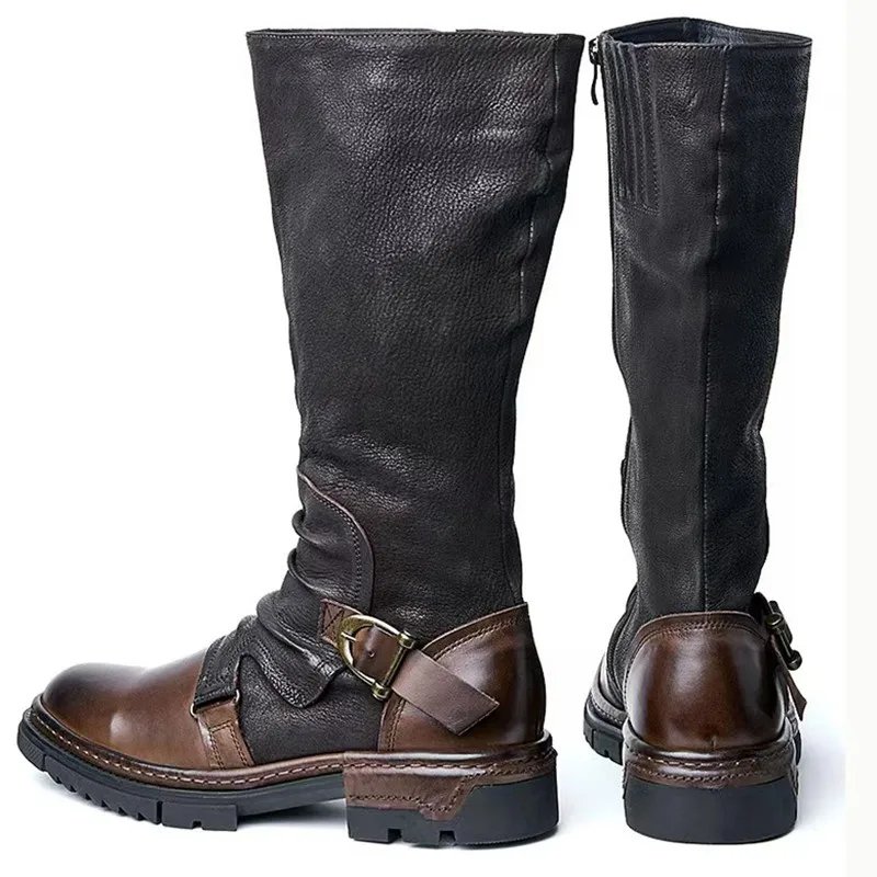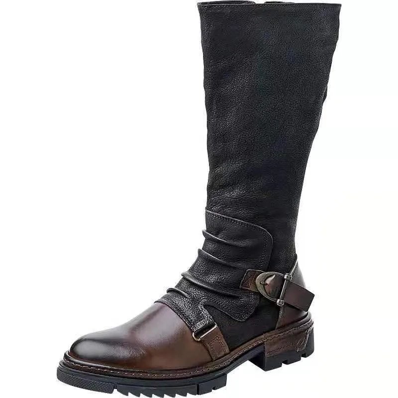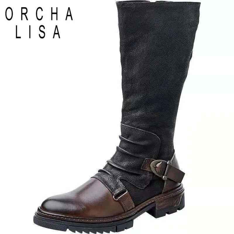 ORCHA LISA Retro Women Riding Boots Round Toe Low Heels Zipper Belt Buckle Mixed Color Plus Size 46 47 48 Leisure Knee High Bota
