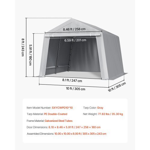 Assembled Dimensions: 10.00 x 10.00 x 8.00 ft / 305 x 305 x 243cm,Item Model Number: SXYCWPD10*10,Tarp Color: Gray,Frame Material:Galvanized Steel Tubes,Net Weight: 77.82 lbs / 35.30 kg,TarpMaterial: PE Double-Coated