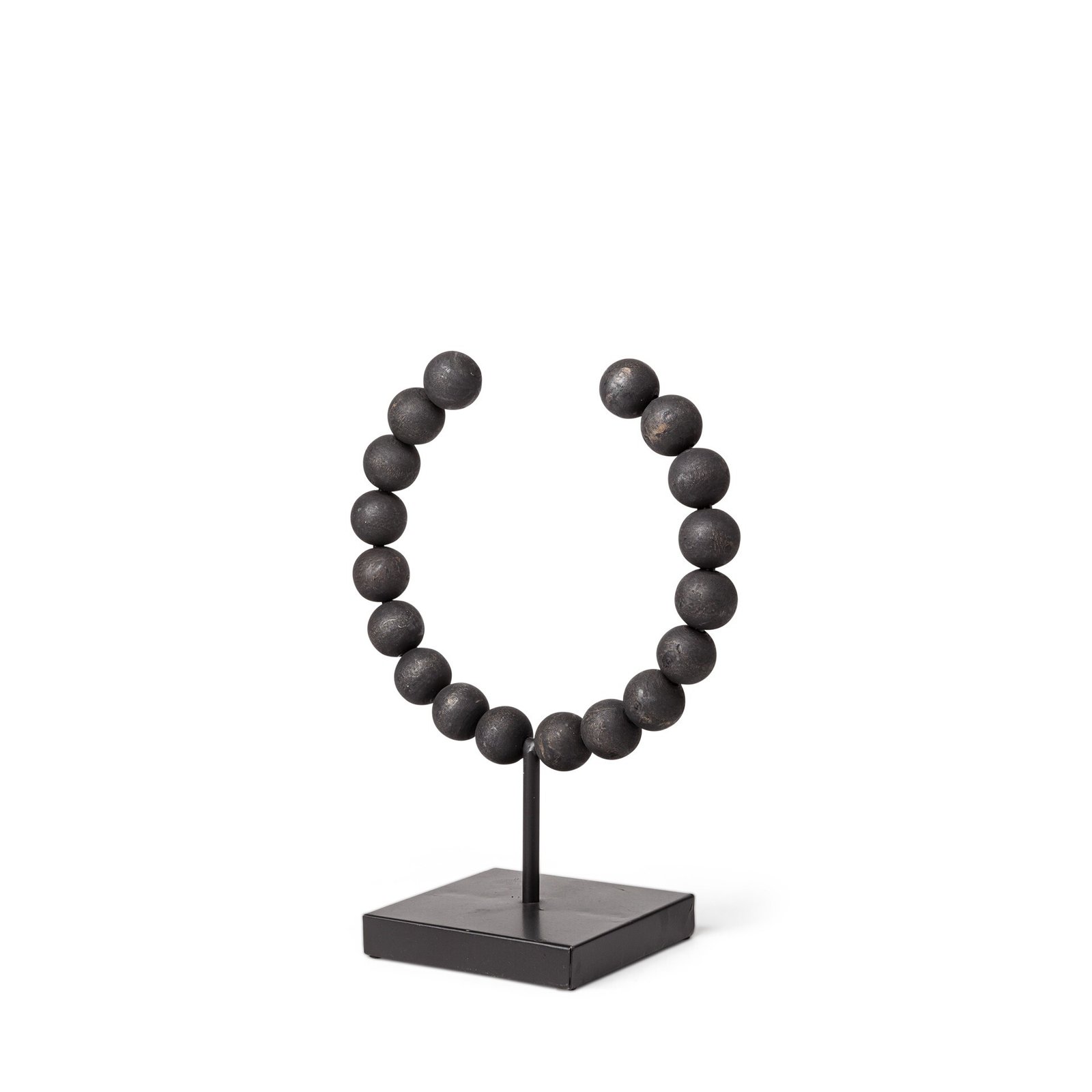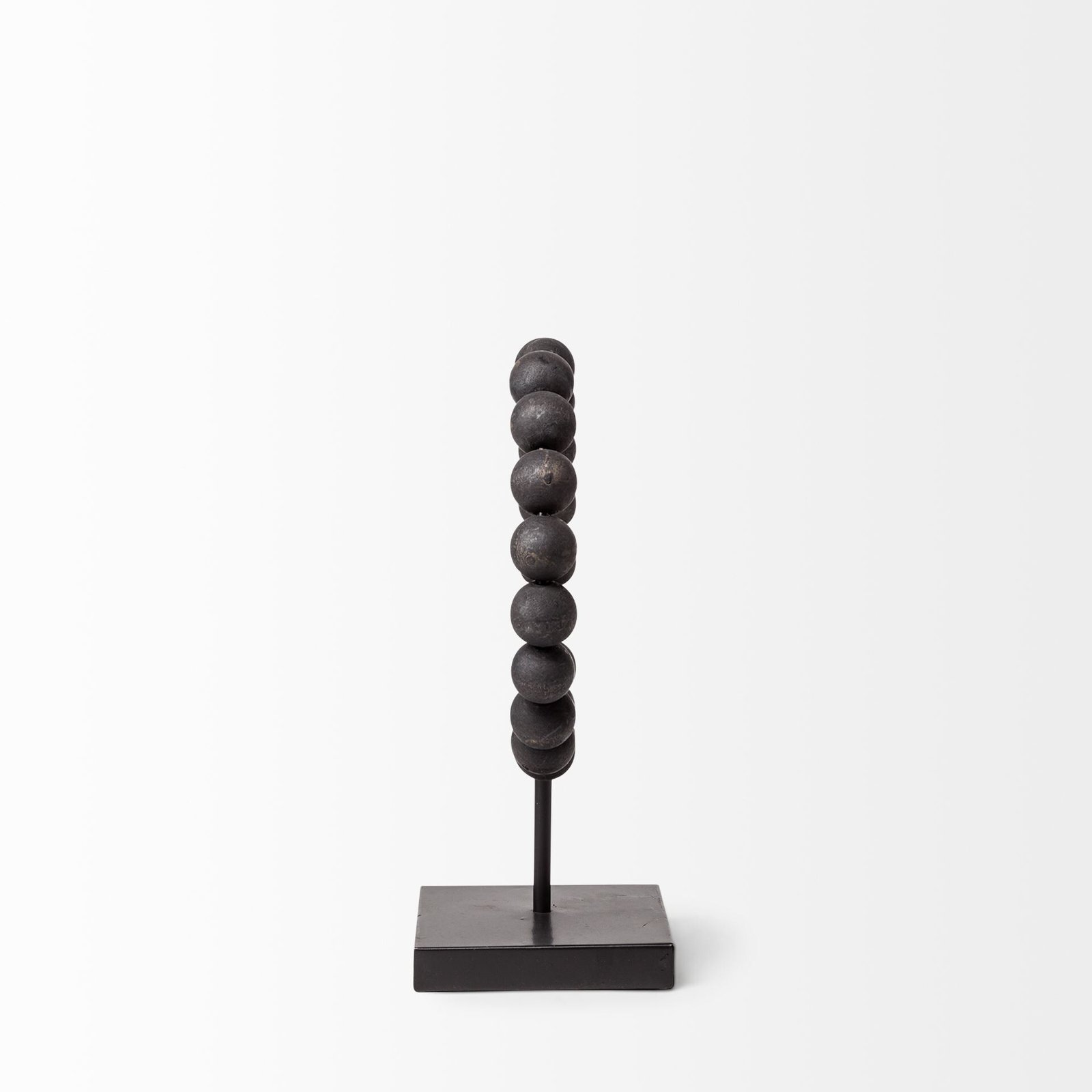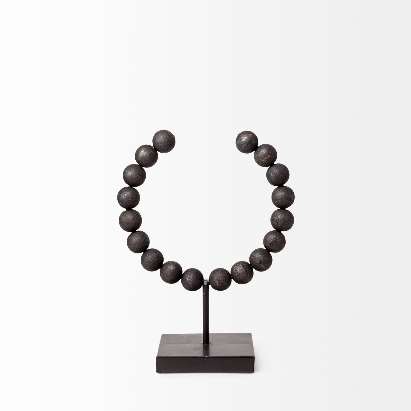 With this contemporary inspired Petite Black Beaded Decor Piece, you can elevate any space in your home. This piece features a square base that is made from solid metal and has a matte black finish on it. From this base there is a metal rod in the same color that rises up and hold the black beaded piece in place. This beaded piece is made has a metal frame in the shape of a C and has black beads threaded on either side. This small unique piece will look great as part of your existing decor or you can also use it as a stand-alone piece anywhere in your home. 12″ H x 5″ W x 9″ D