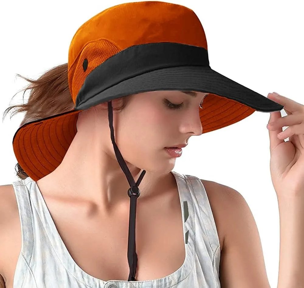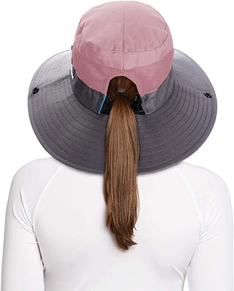 Ponytail Sun Bucket Hats for Women UV Protection Foldable Mesh Wide Brim Hiking Beach Fishing Summer Safari
