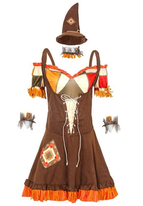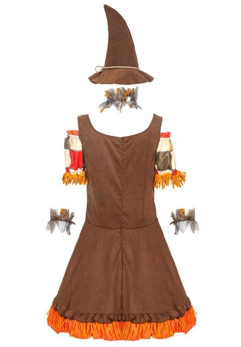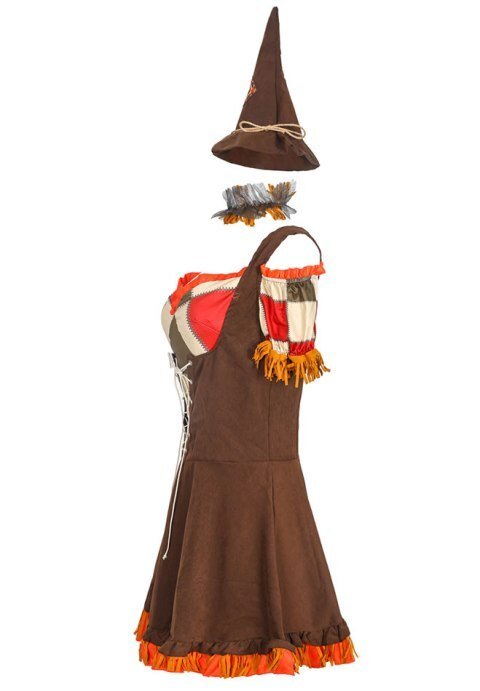 Sweet as candy corn! Keep the crows away in this Sassy Scarecrow costume featuring a brown dress a V-neckline with an orange trim, off-the-shoulder sleeves, an adjustable lace-up front detail, a skirt, a matching hat, a matching collar, and matching wristbands. (Boots not included.)