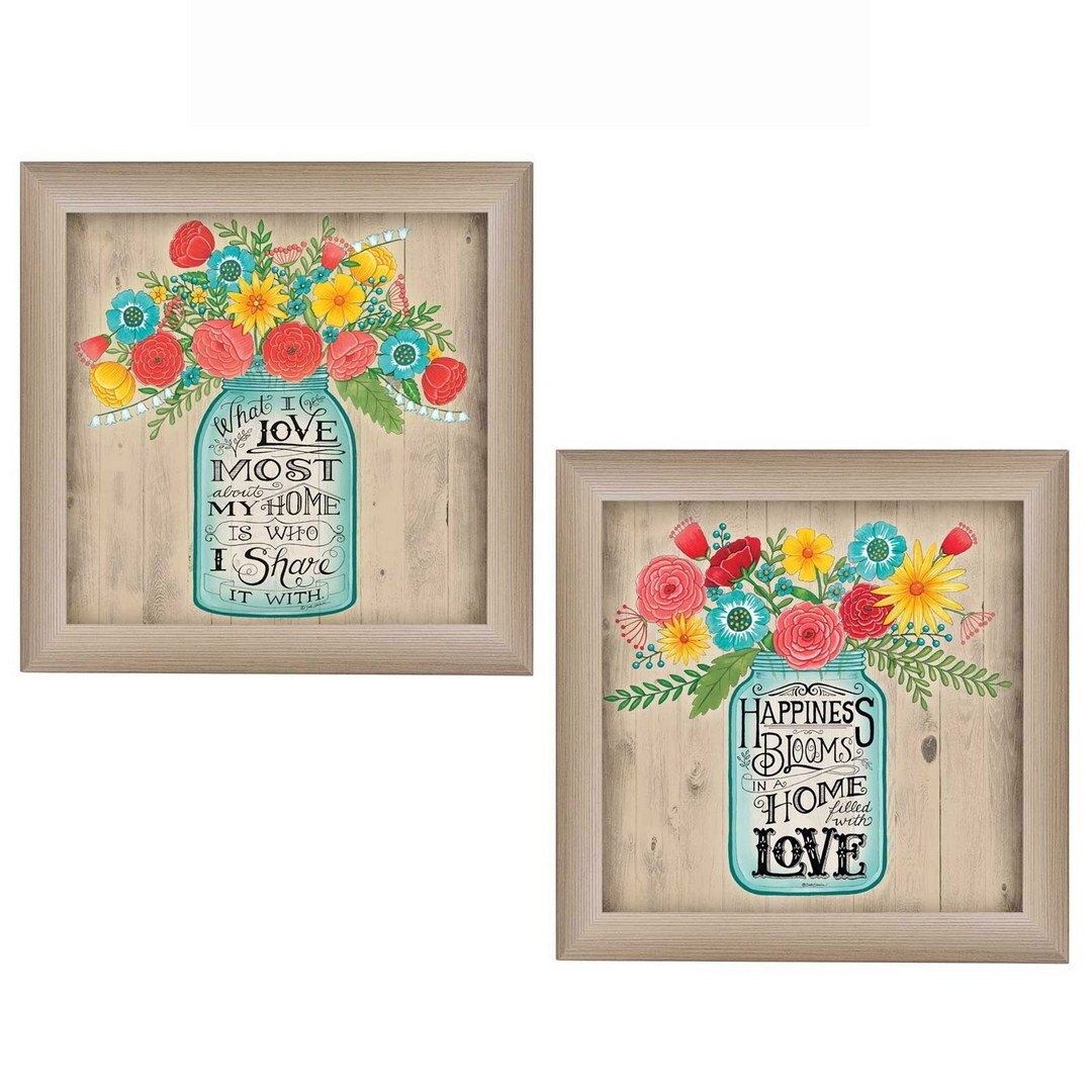 Set Of Two Mason Jar Floral Happiness at Home Brown Framed Print Wall Art