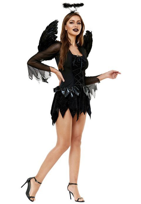 Fall from grace in this Sexy Dark Angel costume featuring a black dress, lace-up detailing, a dark halo headpiece, and matching wings. (Pantyhose not included.)