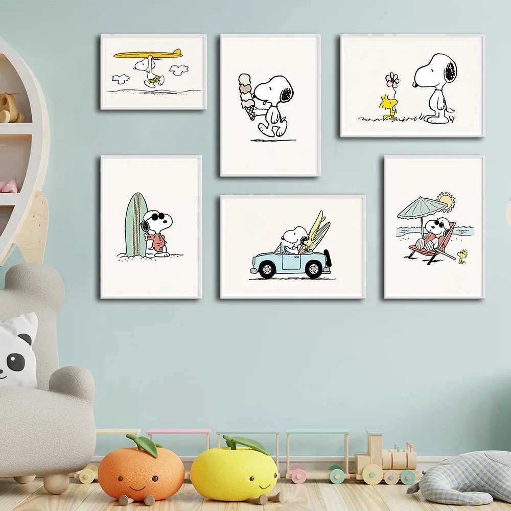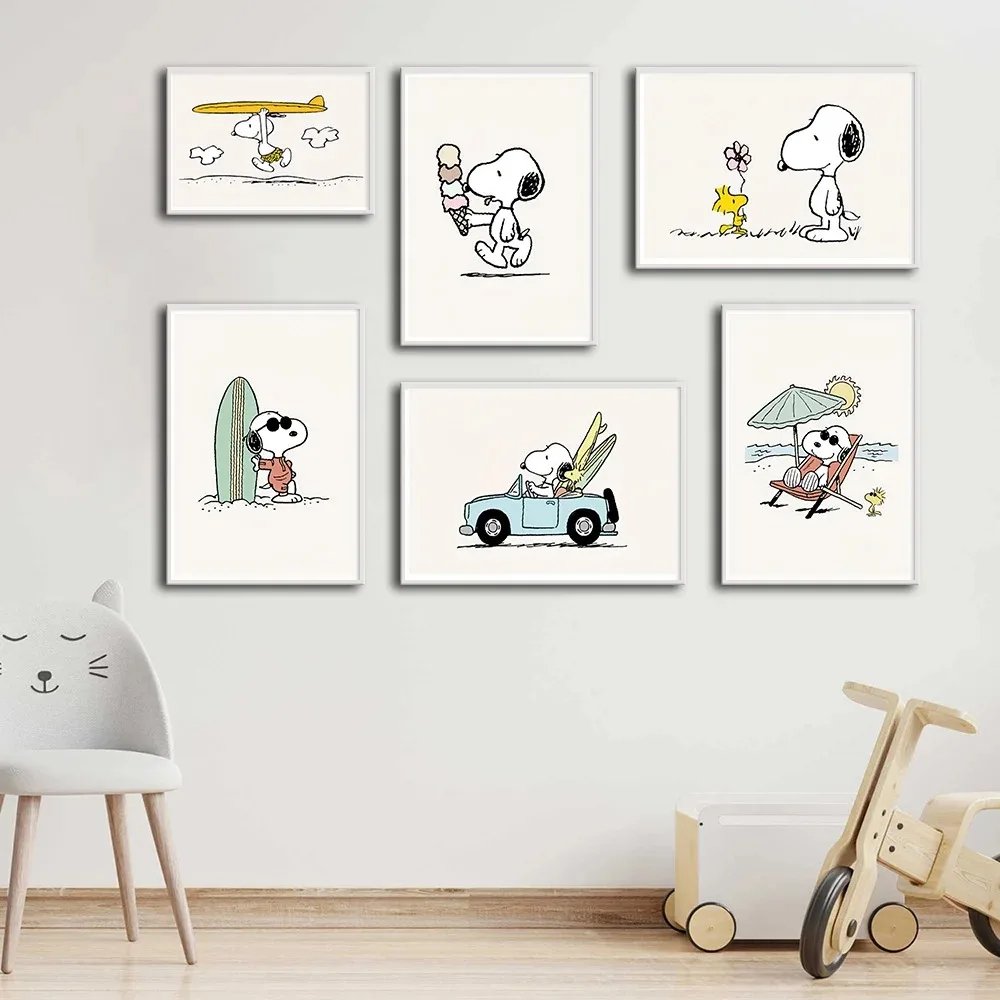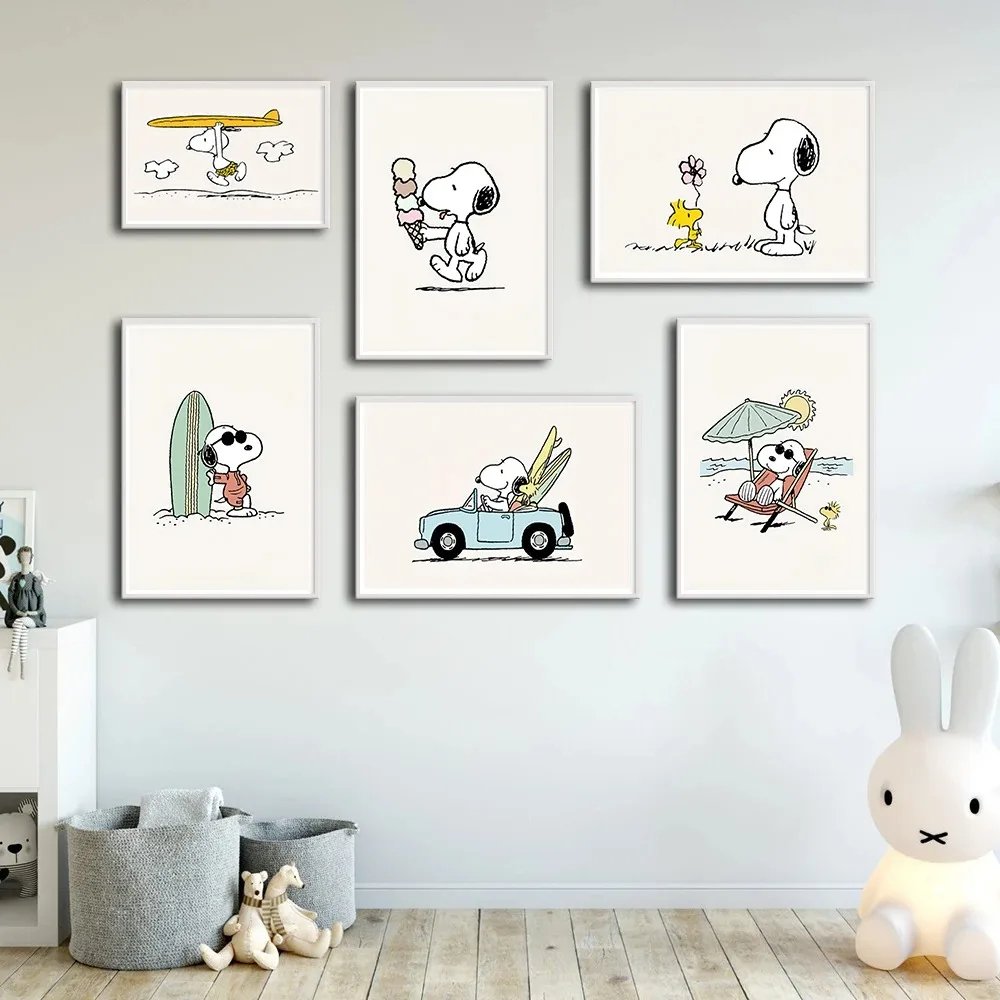 Snoopy Beach Vacation Cartoon Painting Minimalist Nordic Wall Art Surfing Poster Fun Canvas Print Nursery Kid Room Decor Cuadros