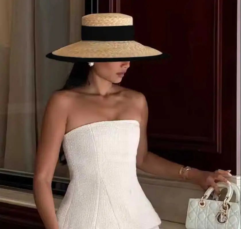 Straw summer hat French elegant ladies seaside travel sun hat Hepburn style wide brim hat 햇빛가리개 모자 모자