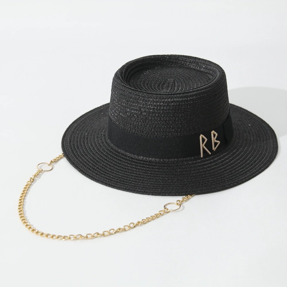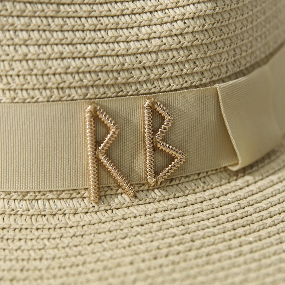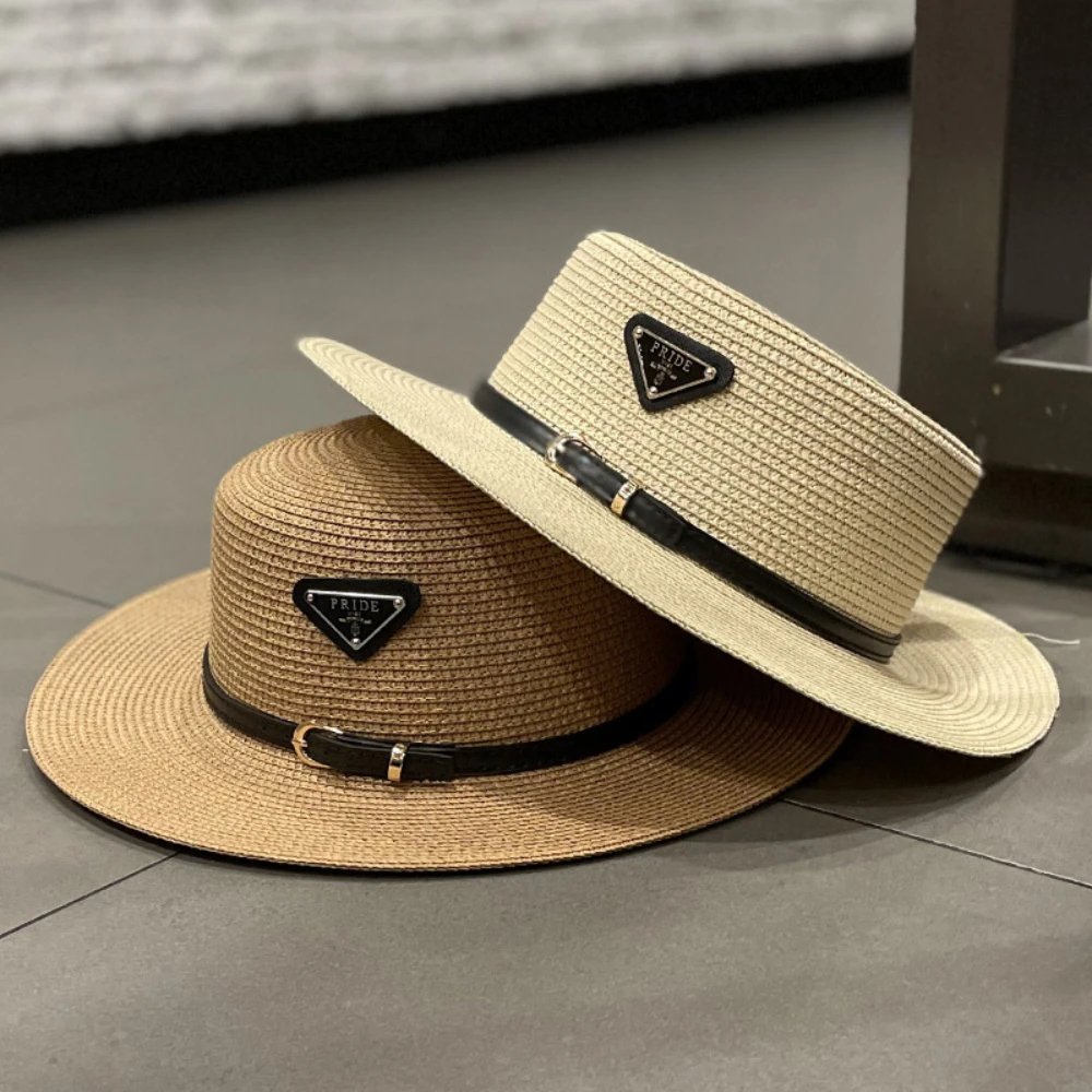 Triangular Metal Logo Straw Hat Women Summer Beach Hat Fashion Sun Hat for Vacation Spring Outfit Wide Brim Hot Sale