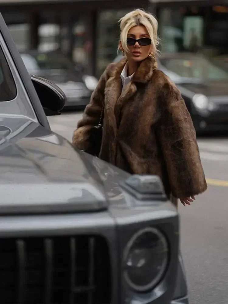 Women Brown Winter Faux Fur Oversized Coat Fashion Loosen Lapel Fluffy Thicken Warm Overcoat 2024 Female High Street Outerwear