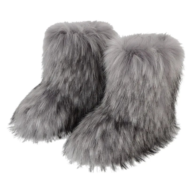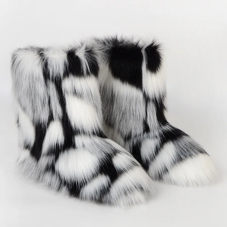 Women Faux Fur Boots Winter Fluffy Plush Warm Mid Calf Snow Boots Luxury Fashion Furry Boots Comfortable Outdoor Flat Shoes