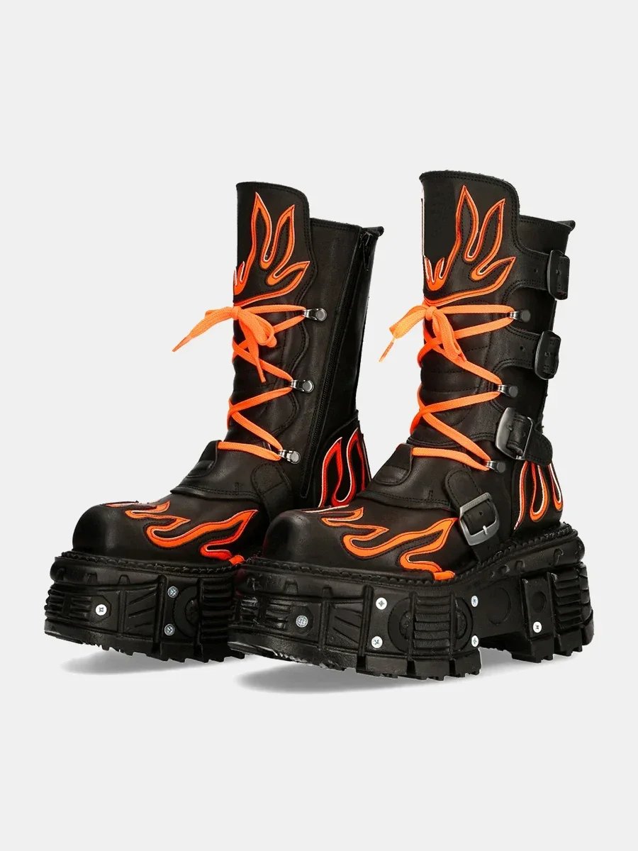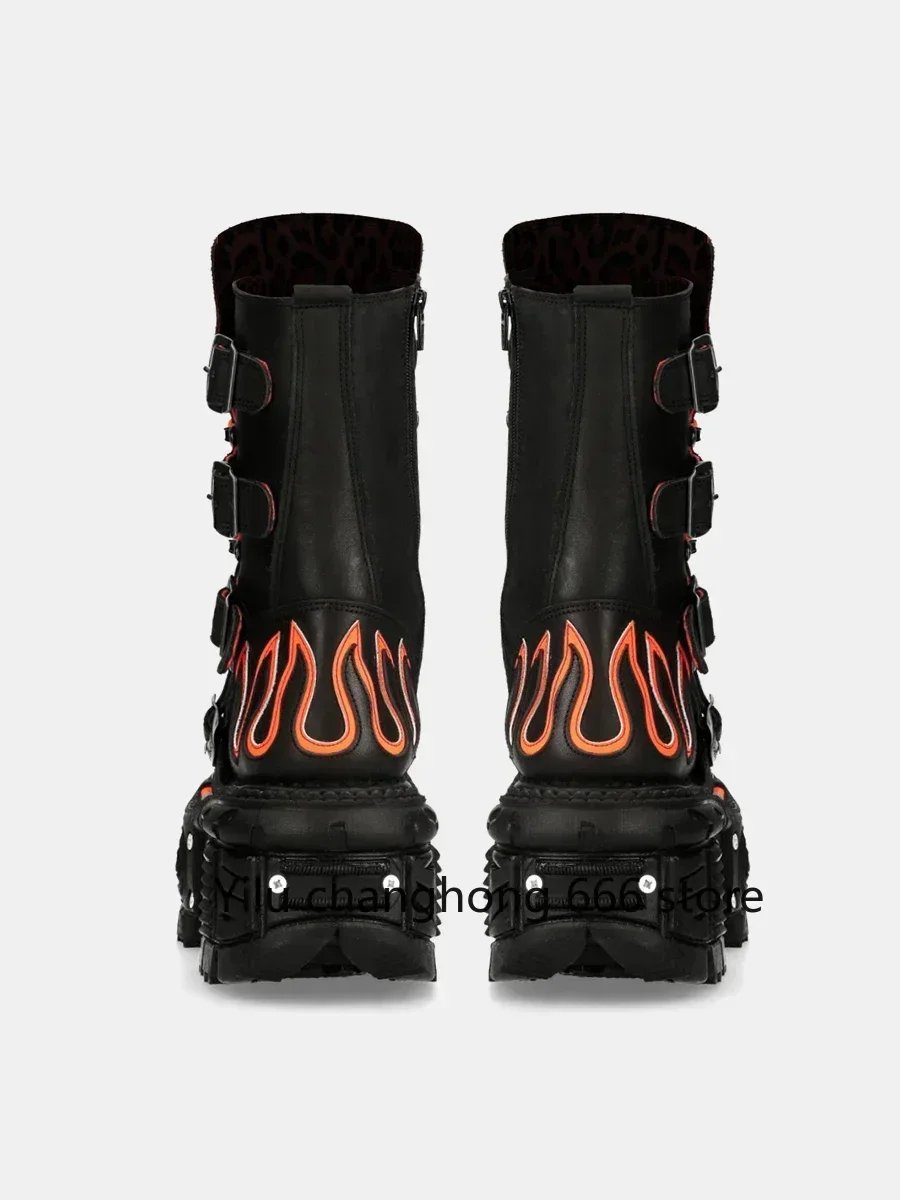Women Punk Retro Fashion Boots Round Toe Thick Sole Lace Up Flats Boots 2024 Metal Decoration Leather Mid Calf Boots Hot Sale